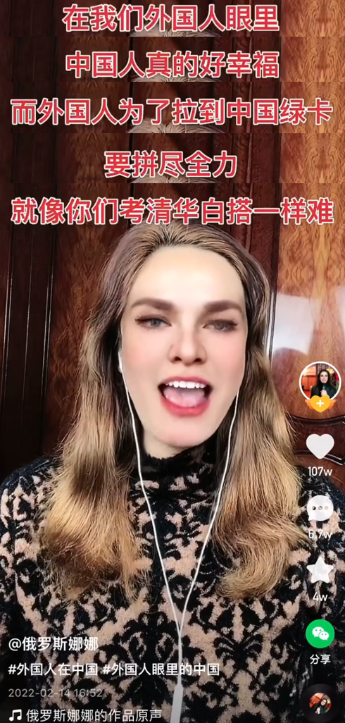 她从外国人网红 1.0 时代那学到了「 猛夸中国人 」的绝学,但更火力全开:什么 “ 中国人一出生就有中国绿卡,而外国人为了拿到中国绿卡,就要拼尽全力,就像你们考清华北大那样难 ” 。