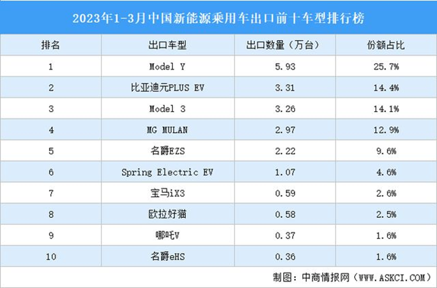 今年一季度中国新能源汽车出口前十名,来源:中商情报网