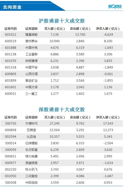 6月15日,北向资金全天净买入92.01亿元,其中,沪股通净买入19.14亿元,深股通净买入72.87亿元。前十大成交股中,净买入额居前三的是宁德时代、五粮液、贵州茅台;净卖出额居前三的是隆基绿能、亿纬锂能、紫金矿业。