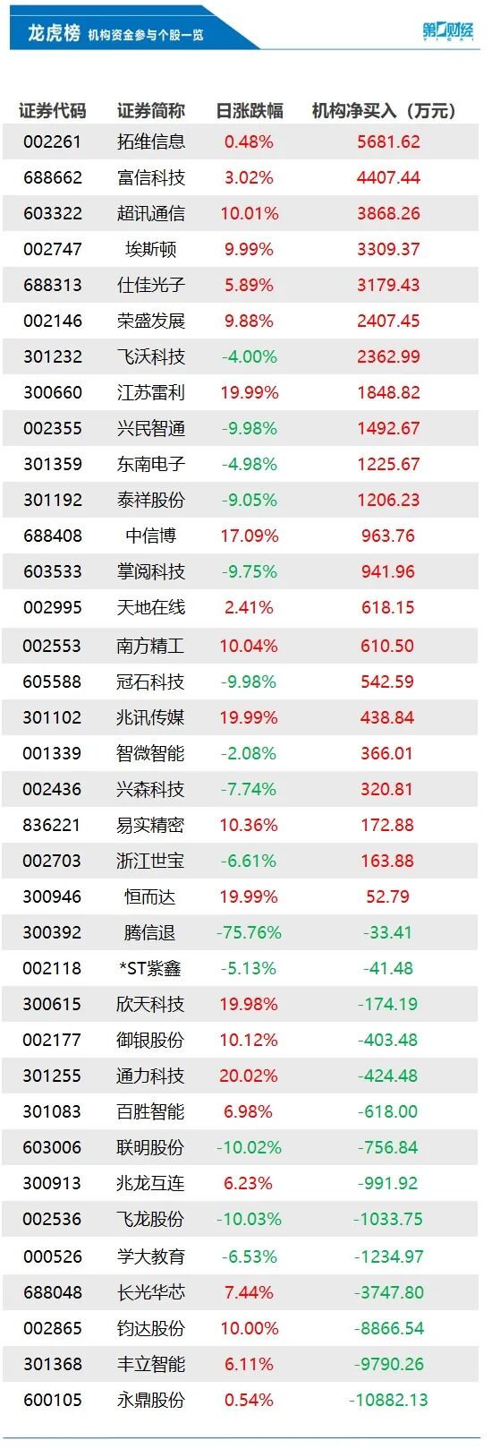 6月15日龙虎榜中,共36只个股出现了机构的身影,有22只股票呈现机构净买入,14只股票呈现机构净卖出。当天机构净买入前三的股票分别是拓维信息、富信科技、超讯通信;当天机构净卖出前三的股票分别是永鼎股份、丰立智能、钧达股份。