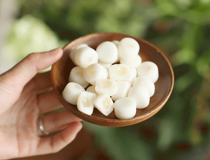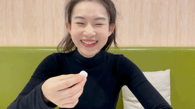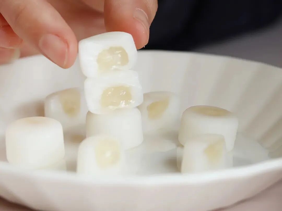 白色的外皮嚼起来是 QQ 弹弹的口感,但它跟小时候吃的 QQ 糖又不一样,更像在吃酸奶味的冰皮月饼。