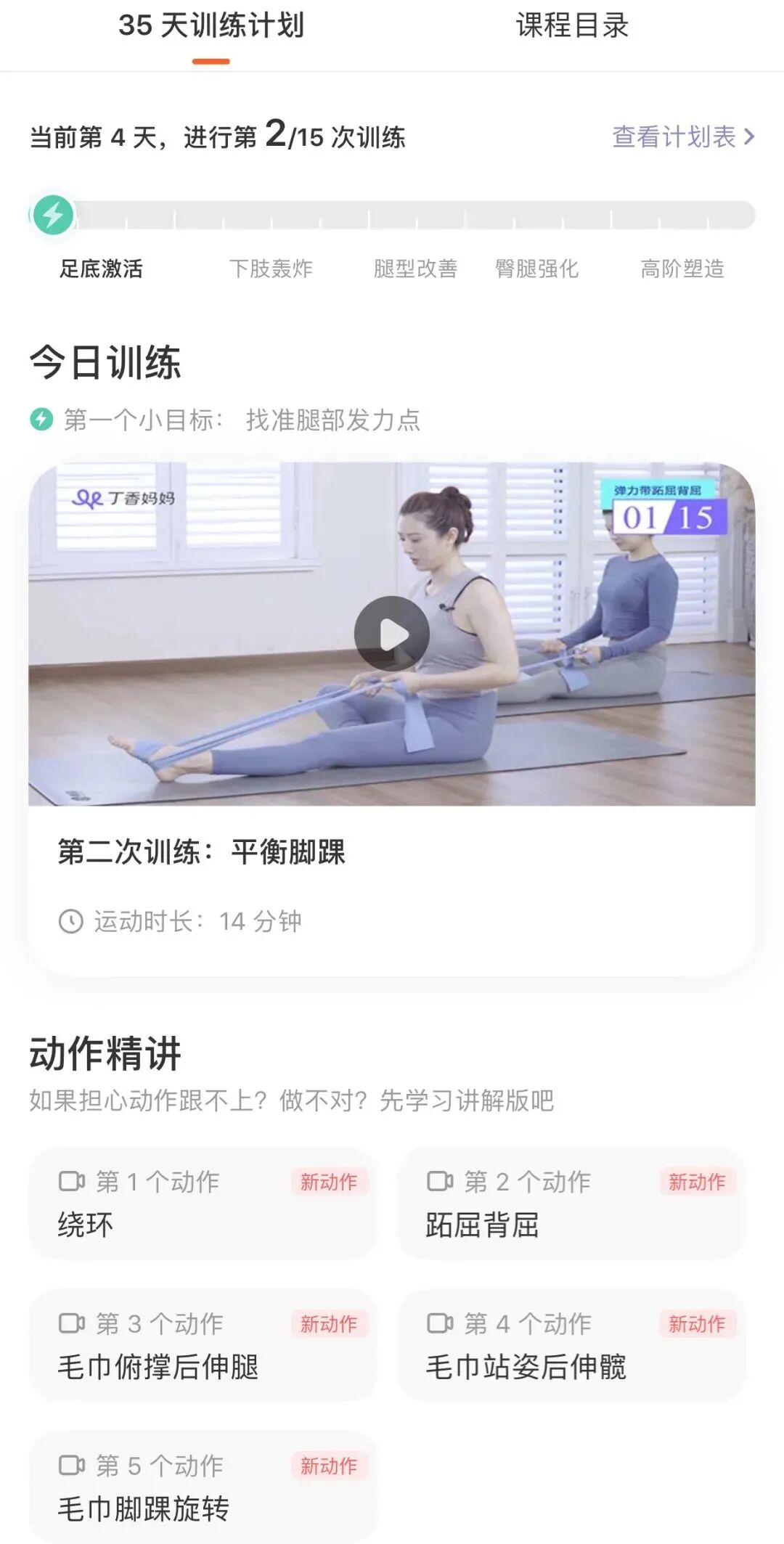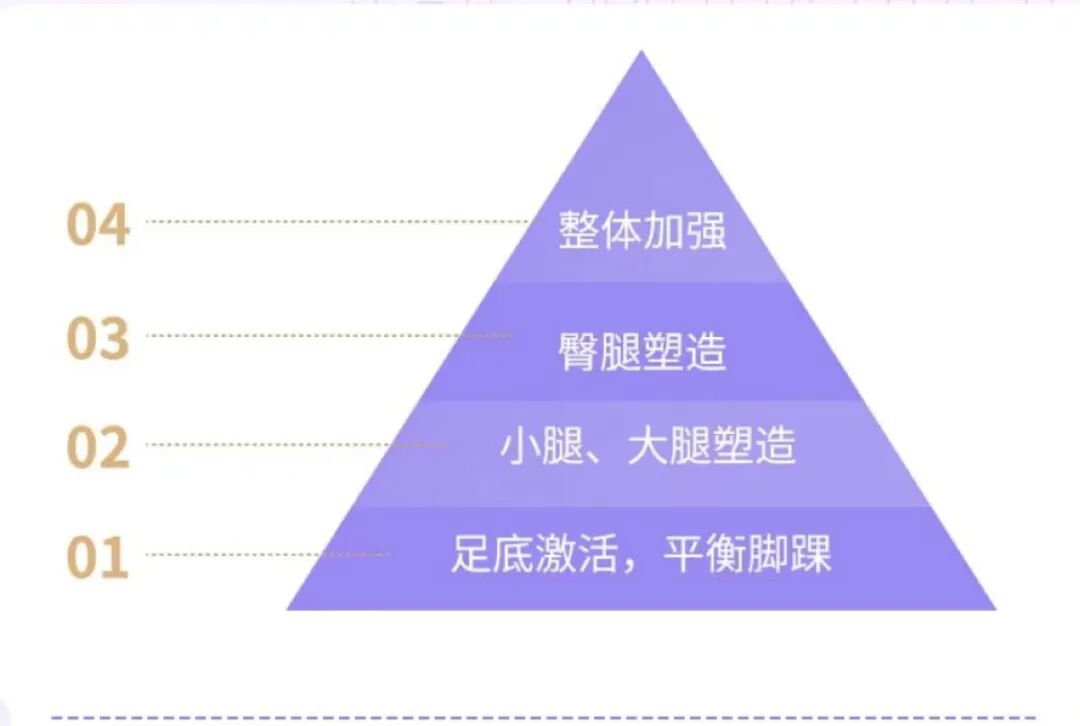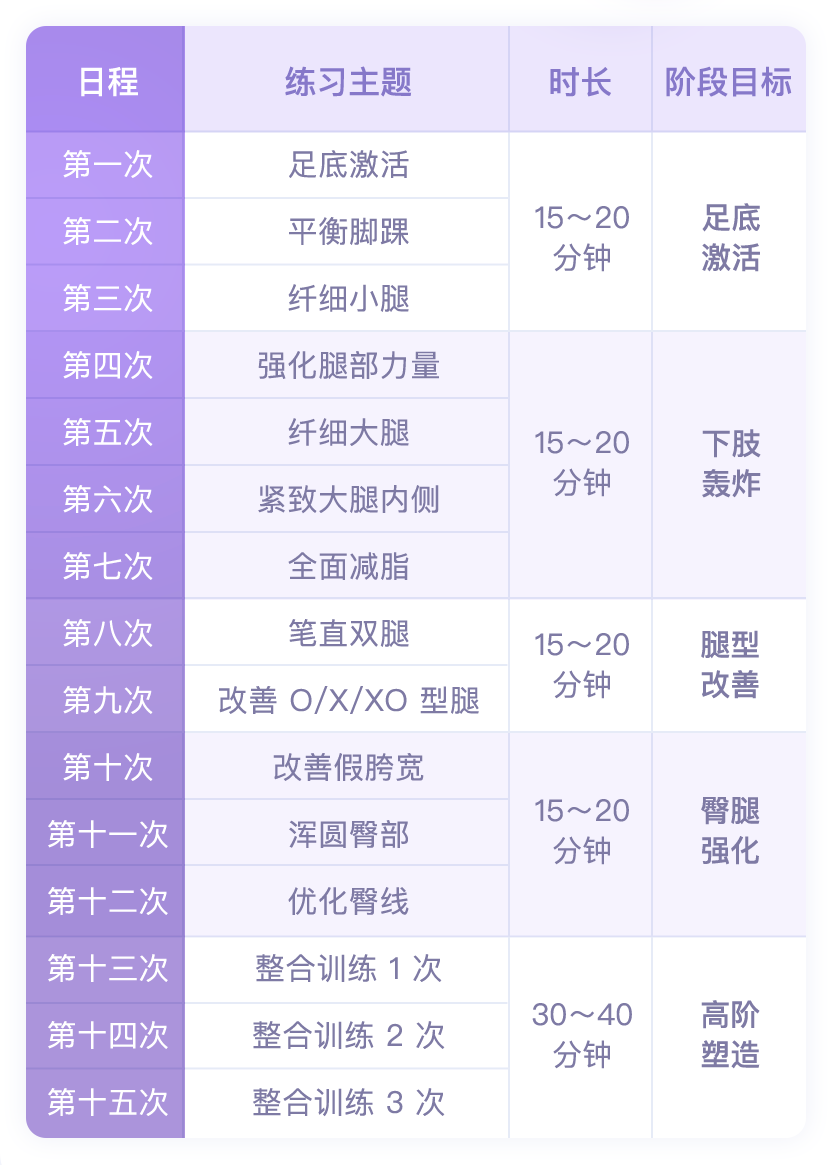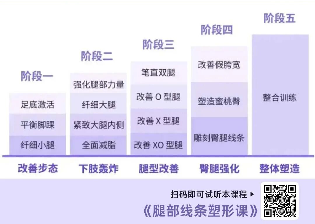 整个课程安排了五个阶段,科学地塑造健康腿部曲线。找对腿部发力点之后,再有效加强小腿、大腿力量,强化臀腿线条,全面塑形。