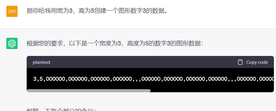 然后可以进行二次创作,用 ChatGPT 生成像素。我的设想是借助 ChatGPT 的能力,让他帮我生成类似导出的数据。但是 GPT3.5 的图形处理能力偏弱,处理一点简单的还行,复杂的就完全不好使了。