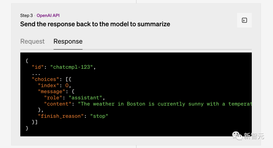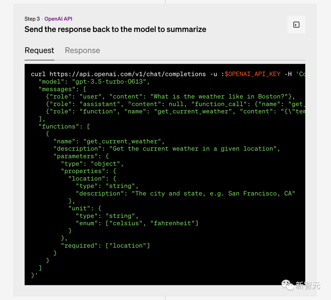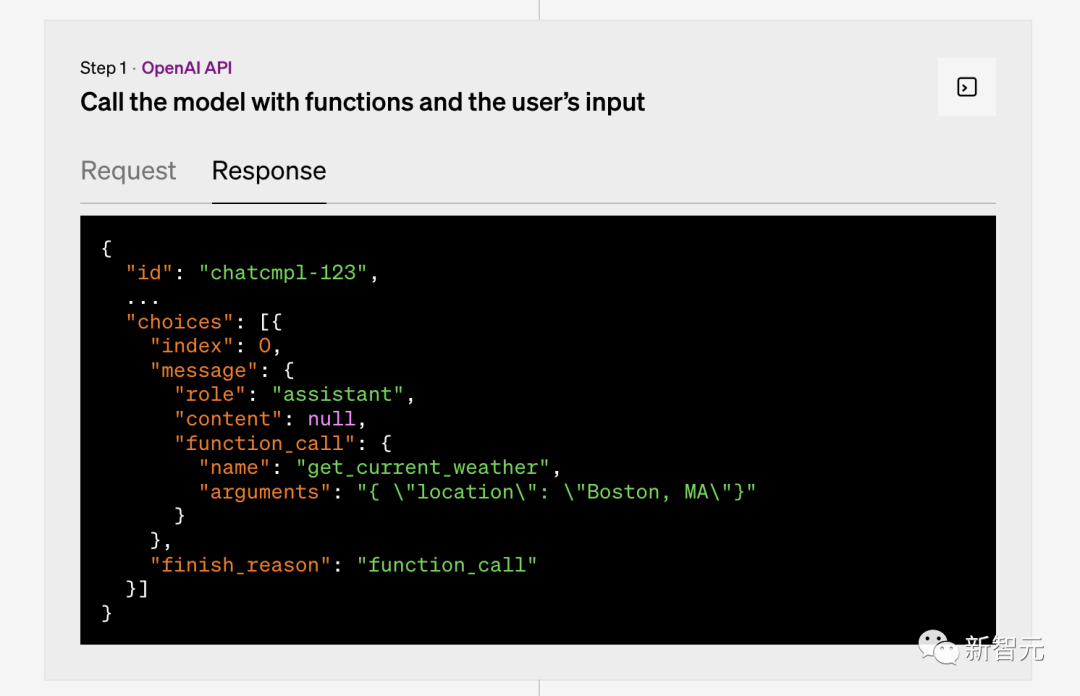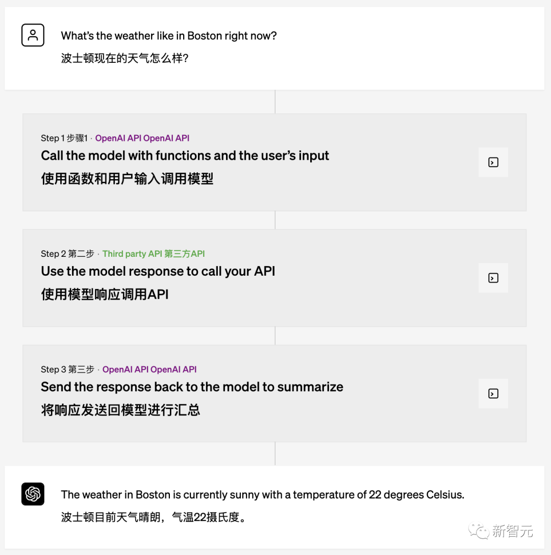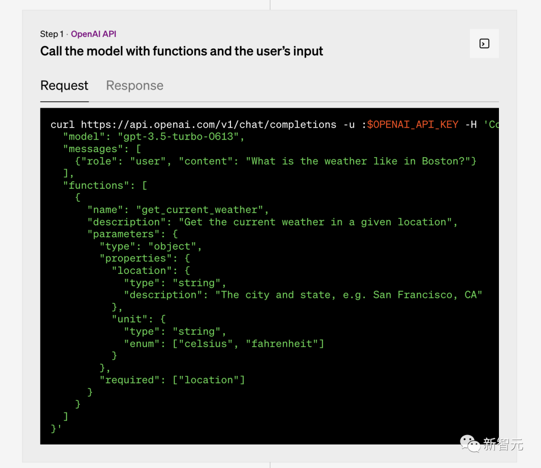 现在,开发者现在可以向GPT-4-0613和GPT-3.5-turbo-0613描述函数,并让模型智能地选择输出包含调用这些函数的参数的JSON对象。这是一种更可靠地将GPT的功能与外部工具和API相连的新方法。这些模型已经过微调,既能检测到何时需要调用函数(取决于用户输入的内容),又能用符合函数签名的JSON来进行响应。函数调用允许开发者更可靠地从模型中获得结构化的数据。比如,开发者可以创建一个聊天机器人,通过调用外部工具(例如,ChatGPT插件)来回答问题。具体来说,可以将诸如「给Anya发邮件,看她下周五是否想喝咖啡」这样的查询转换为send_email(to: string, body: string)这样的函数调用。或者将「波士顿的天气如何?」转换为get_current_weather(location: string, unit: 'celsius' | 'fahrenheit')。此外,开发者还能将自然语言转换为API调用或者数据库查询。比如,将「谁是我这个月的十大客户?」转换为内部API调用,即为:get_customers_by_revenue(start_date: string, end_date: string, limit: int)。又或者把「Acme, Inc.上个月有多少订单?」转换成SQL查询,即为:sql_query(query: string)。只需定义一个名为extract_people_data(people: [{name: string, birthday: string, location: string}]的函数,就能提取维基百科文章中提到的所有人物。以前用户需要在Prompt里加一堆描述才能支持Agent,而现在就简单多了,只要在API请求的时候,传入一个functions参数即可。functions参数实际上就类似于用户要指定的Agent。注意,这里可以是不止一个function,function是一个对象,还可以加上名称(name)、描述(description)、参数(parameters)等等。function_call:调用的函数名,和用户传入的函数名称一致arguments:JSON格式的参数值,包含了用户调用函数需要的参数名称和值。"function_call": { "name": "get_current_weather", "arguments": "{ \"location\": \"Boston, MA\"}" }国外网友表示,function最大的价值就是解决了GPT返回数据结构化的问题,不再需要用户输入复杂的prompt。GPT-4