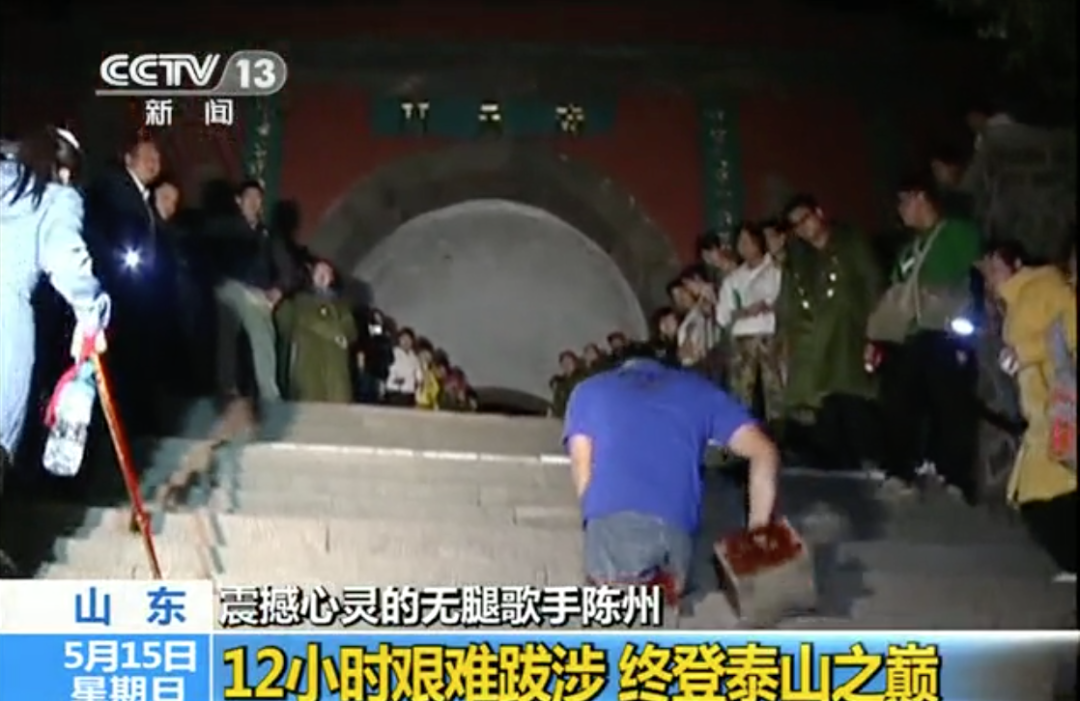 小时候,他的父亲染上赌博,将家里本就不多的钱输了个精光,没过多久,就扔下他们一家离家出走了。无助的妈妈拉着陈州和弟弟也要走,他的爷爷却突然拦住妈妈,“扑通”一声跪在她面前,恳求她:本就破败的家庭雪上加霜,爷爷没钱供他上学,只能带着他到处流浪,以卖艺为生。于是,他偷偷溜到一列运货的火车上,火车开动后,他才发现方向反了。情急之下,他跑到车厢的连接处往下爬,爬到一半,他想也没想就跳了下去。这一跳,命运的列车更换了轨道,载着陈州往苦难的方向驶去。他的全部生活被困在了一张棕板床上,吃喝拉撒睡全在上面,唯一陪伴他的,只有从窗外透进来的一缕阳光。那时,陈州最大的愿望就是出去晒晒太阳,和好久不见的发小聊天畅玩。昔日的好友变得冷漠而陌生,一见到他就大喊:“怪物来了,我们快跑。”绝望袭来,他每天都在哭,爷爷奶奶给他端来饭,他也不吃,两位老人看着哭成泪人的他,也跟着哭。找不到活下去的意义,陈州尝试自杀了三十多次,撞墙、喝药......但一次都没有成功。那些和他不曾相识过的好心人们像商量好了似的,一次又一次的爱心接力,将他从死神边缘拉回来。他决定爬出去,爬出小屋,爬出院子,爬出他生活了13年的村庄。某一天,趁着爷爷奶奶下地干活,他爬了出去,到村头的公路拦下了一辆车。目的地是他想去却没去成,最后还改变了他一生的城市——济南。冰天雪地的夜晚里,陈州被冻得瑟瑟发抖,他找到一处冒着热气的下水井盖,将整个身子趴下去,贴着它,一股暖洋洋的气流经过他的全身,他感到了久违的温暖。这个地方被他当做一个宝地,怕被人占去,他迟迟不敢离开。记不清过了几个小时,饿昏眼的陈州,模模糊糊中看到一个老奶奶缓缓走近他,弯下身,亲切地问了一句:从13岁到18岁,他的整个青春都是在恐惧中度过,每天都在担心自己的下顿饭在哪。那时的他不知道梦想为何物,最大的愿望就是能吃饱饭,第二天睁开眼,发现他还活着。一个路过的女孩看到他就掏口袋,陈州见状就伸手准备去接。没想到,那个女孩连连往后退,朝他大喊着“别过来”,说完,丢给他一个硬币就急匆匆地走了。“原来靠别人可怜,靠这样一个残疾的身体去博取大家的同情心,不是本事,它甚至是一件挺丢人的事儿。”于是,他开始卖报纸,到大街上给人擦皮鞋,在夜市上摆摊。因为他不再是一个潦倒不堪的乞丐,他可以每天都穿得干干净净的,像一个健全的人一样,靠自己的双手去劳动,去赚钱。下定决心要靠自己的双手去生活后,陈州迎来了第二个身份:流浪歌手。陈州激动地说:“唱歌不光救了我,还救了我一辈子。”毫无来由的冲动驱使着他走向前,询问他们能不能让自己唱一首歌。陈州拿起话筒,唱了一首《水手》,唱的时候,他注意到,围过来的人越来越多,唱完之后,他回头看那两个人,两人对他上下摆着手:“再来一首,再来一首。”演出结束后,陈州的耳边顿时传来了汹涌的掌声,他感到很惊喜。陈州仿佛找到了黑暗洞穴的出口,毫不犹豫地加入他们,成为了一名流浪歌手。第一次带给他掌声的这首《水手》,他唱了三千多遍,歌声响过七百多个城市。为他而奏响的掌声如潮水一般,一波接着一波,推着他遇到了人生中最美的际遇。他注意到右前方有一个清秀漂亮的女孩在默默注视着他,笑着为他鼓掌,并且,一连七天都出现在同样的位置。两人相识时,正逢九江的梅雨期,一连下了28天的雨。缘分使然,陈州原本的行程被迫搁置,两人有了相处的机会。女孩名叫喻磊,在附近的服装店上班,陈州鼓起勇气要了她的电话号码,回去后,每天都给她打电话,从一开始十多分钟到后面的几个小时,IC卡用了一张又一张。最浪漫的是,他们一起在屋檐下躲雨,两人互相注视着彼此,直到天亮。有一次,喻磊生病了,陈州听她的同事说去医院打针了,也不知道是哪个医院,冒着大雨,他逛了4个小时才找到喻磊。在医院的楼道里,他靠着墙大口喘着气,全身都在滴水,喻磊看到这一幕,感动得直掉泪。不料,第二天消息就传到了喻磊的经理那,经理以维持店面形象为由要求喻磊和陈州断绝来往,喻磊脱口而出:“那我不干了。”从那之后,喻磊跟着陈州过上了四海为家的生活,两人一边流浪,一边卖唱,坎坷的路上相依相伴,互相温暖着彼此。喻磊的出现让陈州发现了世界的另一面,“原来人可以活得那样幸福”。他默默地给自己的人生判了死刑,将爱情、结婚生子、成家立业自动排除在自己的人生之外。他早就已经想好了自己的宿命,流浪一生,孤独终老,最后可能死在地里,或是一个池塘边。是喻磊勇敢的爱告诉他,原来自己也可以像健全的人一样拥有幸福。继流浪歌手后,陈州迎来了自己的第三个身份:爬山勇士。“我怎么没有脚,你听,‘噔噔噔’......”他抬起他的小木盒迈上台阶,每向前一步就会发出“噔”的一声,那就是陈州的脚步声。他看着上山下山的人群,不禁好奇泰山有多高,随口问了一个路过的游客。没想到,这个游客上下打量了他一番,满脸鄙夷:“你觉得你能登上去吗?”气了一晚上,第二天,他换上一身干净整洁的衣服,把他的“鞋”擦得锃亮锃亮的,站到了泰山脚下。他从白天爬到了夜晚,一路上,他的双手被磨了很多水泡,因为长时间来回摩擦用力,水泡很快就破了,陈州疼得脸皱作一团。路过的游客都穿着棉袄,只有他穿着短袖,脸上的汗水不停地滴落。围观的游客纷纷为他呐