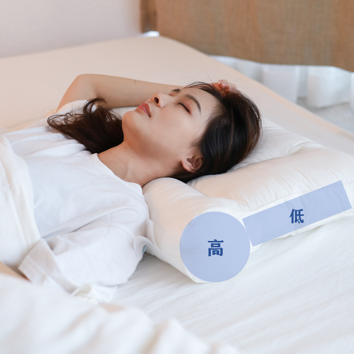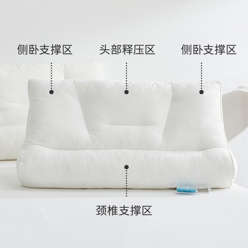 这也是我喜欢这个枕头的原因——完全按照人体工学分区设计。护颈枕一共分为四个区:颈椎支撑区、两个侧卧支撑区和头部释压区。仰睡时能维护我们的颈椎曲度,侧卧时能保持我们的脊椎水平。
