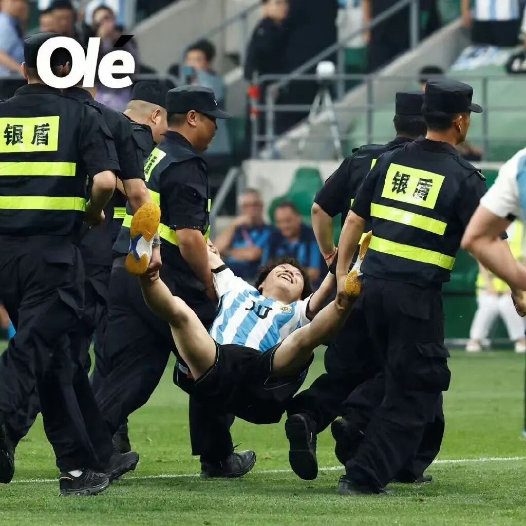 现场的七八个保安一边追一边笑,不知道是真的跑不到还是真的不想追,他身后那个保安大哥像藏不住里面穿着阿根廷球衣一样藏不住他的欢乐。