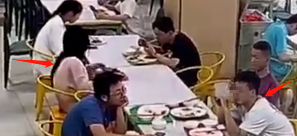 监控画面显示,这位穿着连衣裙的女生,拿着自己没吃完的烤鸭饭,绕过桌子走到白色男生的身后。