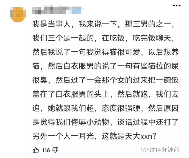 更离谱的是,据说在几个人争论的过程中,女生还动手打了其中一个男生,还骂男生长得丑。