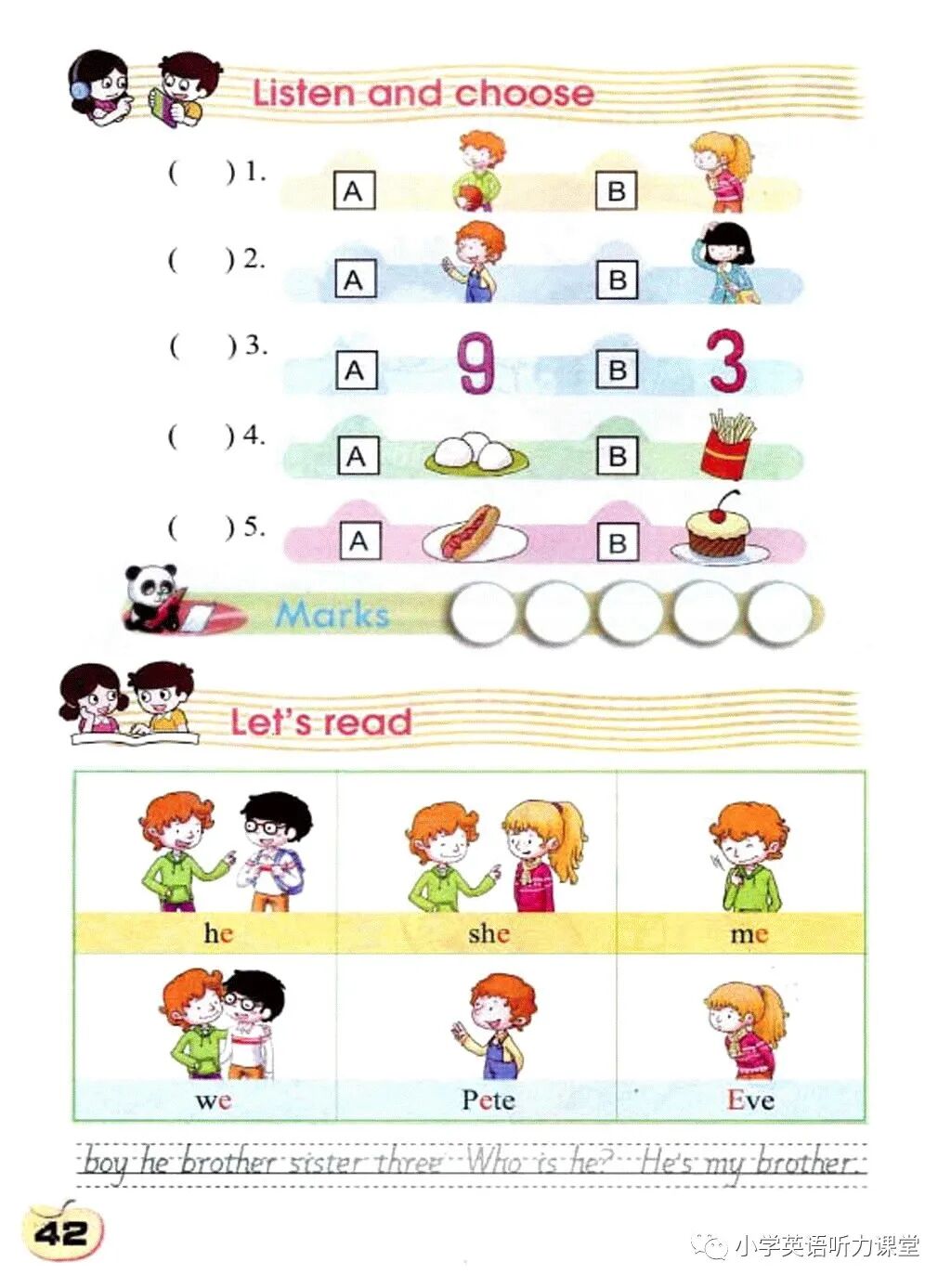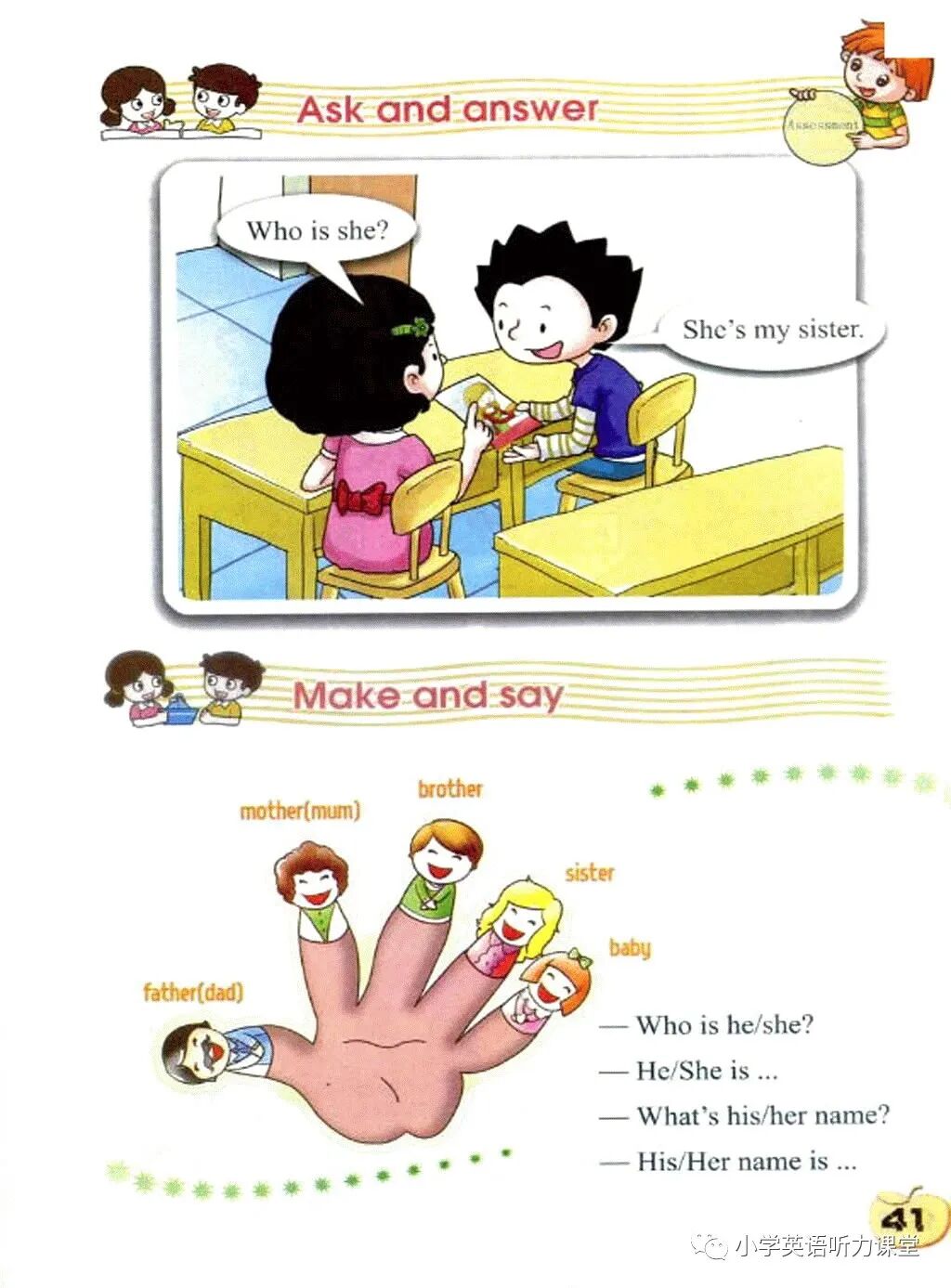 Lesson 8 Who is he? 第8课 他是谁? Ask and answer问与答Who is she?She's my sister.她是谁?她是我的妹妹。Make and say先制作,再说一说Who is he/ she?He/ She is ...他/她是谁?他/她是...... What’s his / her name?His/ Her name is ...他/她的名字是什么?他/她的名字是......Listen and choose听录音并选择1.Who is she?She is Eve.她是谁?她是伊芙。2.Who is he?He is Pete.他是谁?他是皮特。3.How old are you?I’m three.你几岁了?我三岁了。4.Can he make buns?Yes.他会做馒头吗?是的。5.Please have a cake.请吃一块蛋糕。Let's read读一读