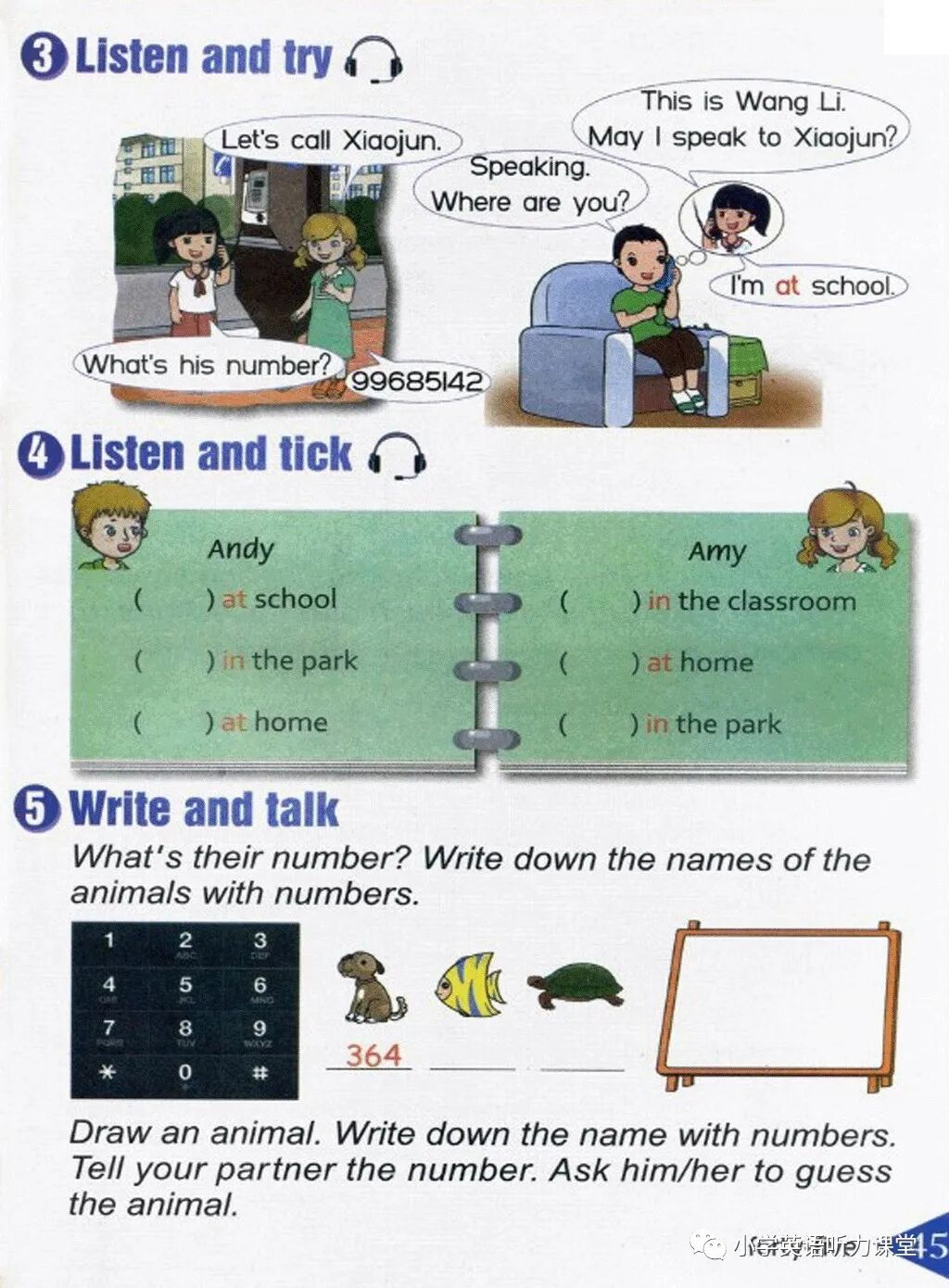 3.Listen and try.听一听,试一试。Let's call Xiaojun.咱们给小军打电话吧。What's his number?99685142.他的电话号码是多少?99685142。This is Wang Li.我是王丽。May I speak to Xiaojun, please?我能和小军说话吗?Speaking.我就是。Where are you?你在哪儿?I'm at school.我在学校。4.Listen and tick.听音并打勾。Hello?喂?Hello, this is Andy.你好,我是安迪。Hi, Andy.嗨,安迪。Where are you?你在哪里?I’m at school.我在学校。Hello?喂?Hello, this is Amy.你好,我是艾米。May I speak to Zhang Jia, please?我可以和张佳说话吗?Speaking!我就是。Where are you, Amy?艾米,你在哪里?I’m at home.我在家。5.Write and talk.写一写,说一说。What’s their number?他们的号码是多少?Write down the names of the animals with numbers.用数字写下动物的名字。Draw an animal.画一只动物。Write down the name with numbers.用数字写下名字。Tell your partner the number.告诉你的搭档号码。Ask him/ her to guess the animal.让他/她猜动物。