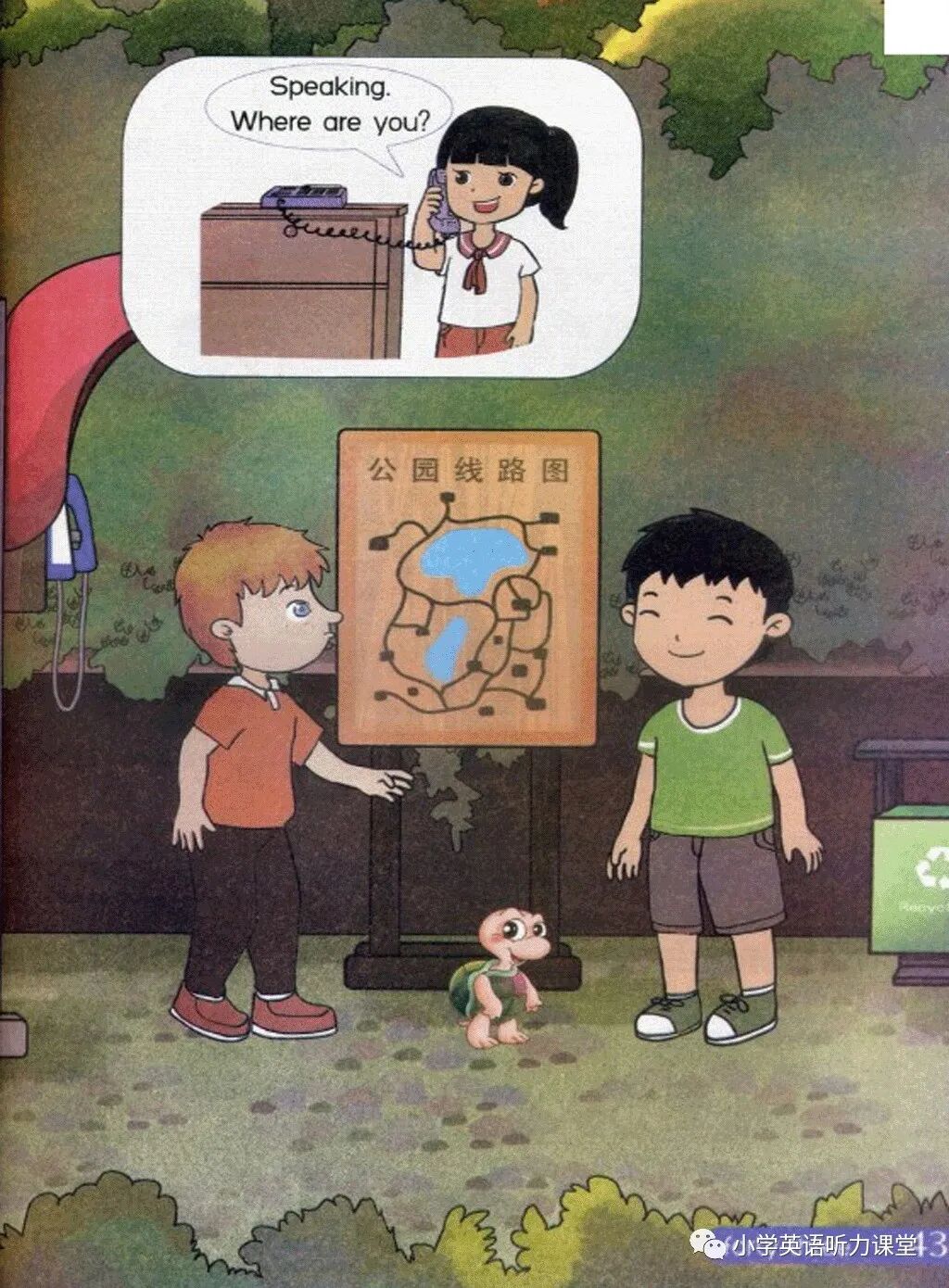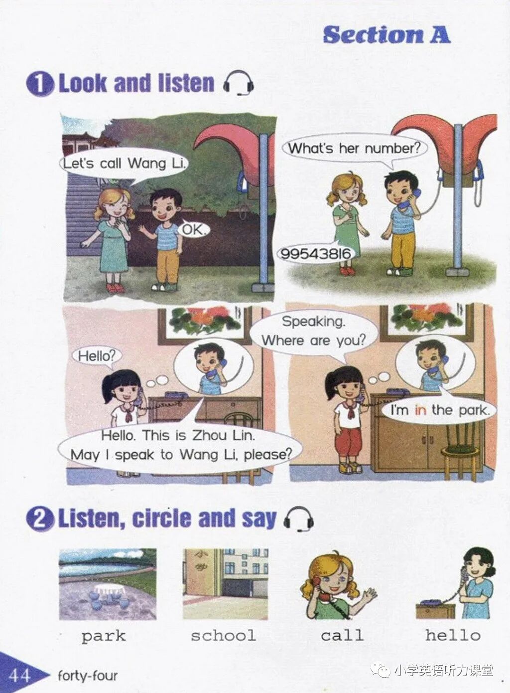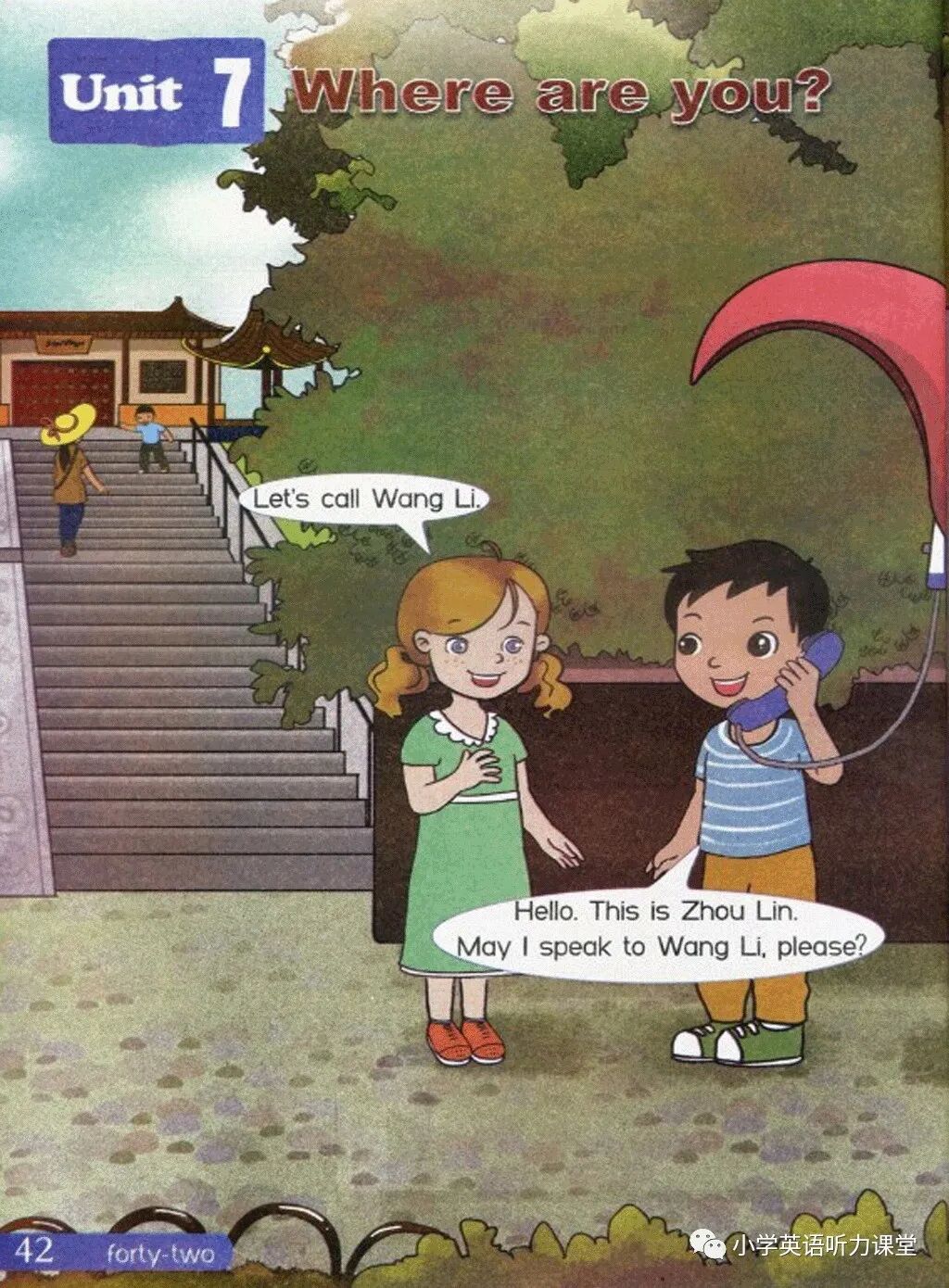 Unit 7 Where are you? 第七单元你在哪儿? Section A 模块A1.Look and listen.看一看,听一听。Let's call Wang Li.咱们给王丽打电话吧。OK.好的。What's her number?99543816.她的电话号码是多少?99543816。Hello?喂?Hello. This is Zhou Lin.喂。我是周林。May I speak to Wang Li, please?我能和王丽说话吗?Speaking. Where are you?我就是。你在哪儿?I'm in the park.我在公园里。2.Listen, circle and say.听音,画圈并说一说。