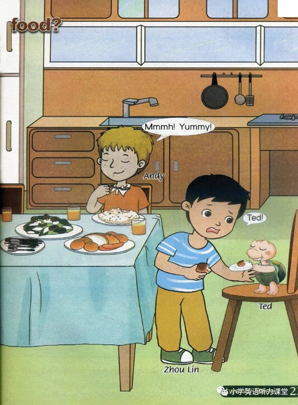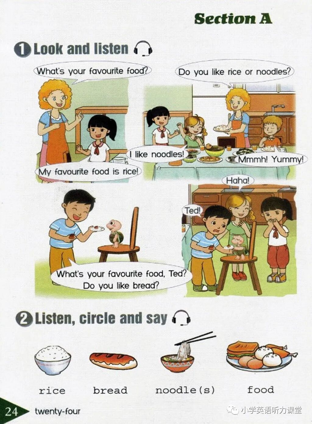 What's your favourite food?My favourite food is rice!Do you like rice or noodles?What's your favourite food, Ted?2.Listen, circle and say.