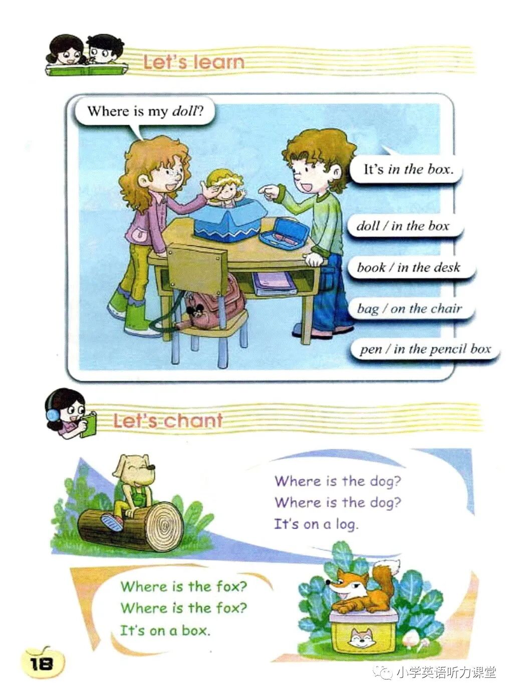 Lesson 4WHERE IS MY DOLL?第4课 我的洋娃娃在哪里?Let's talk说一说Where is my doll?我的洋娃娃在哪里?Is it on your bed? No.它在你床上吗?没有。Look! It's in the box.快看!它在盒子里。Oh, yes, thank you.噢,是的,谢谢你。I can't see Miss Fox.我没见到狐狸小姐。Where is she?她在哪儿?Is she with Mr Dog? No.她和狗先生在一块吗?没有。Look! She is with Mr Frog.快看!她和青蛙先生在一块。Oh, yes.噢,是的。Let's learn学一学Where is my doll?我的洋娃娃在哪里?It's in the box.它在盒子里。doll洋娃娃in the box在盒子里book课本in the desk 在课桌里bag书包on the chair在椅子上pen钢笔in the pencil box 在铅笔盒里Let's chant唱一唱Where is the dog?Where is the dog?It's on a log.狗在哪里?狗在哪里?它在木头上。Where is the fox?Where is the fox?It's on a box.狐狸在哪里?狐狸在哪里?它在一个盒子上。