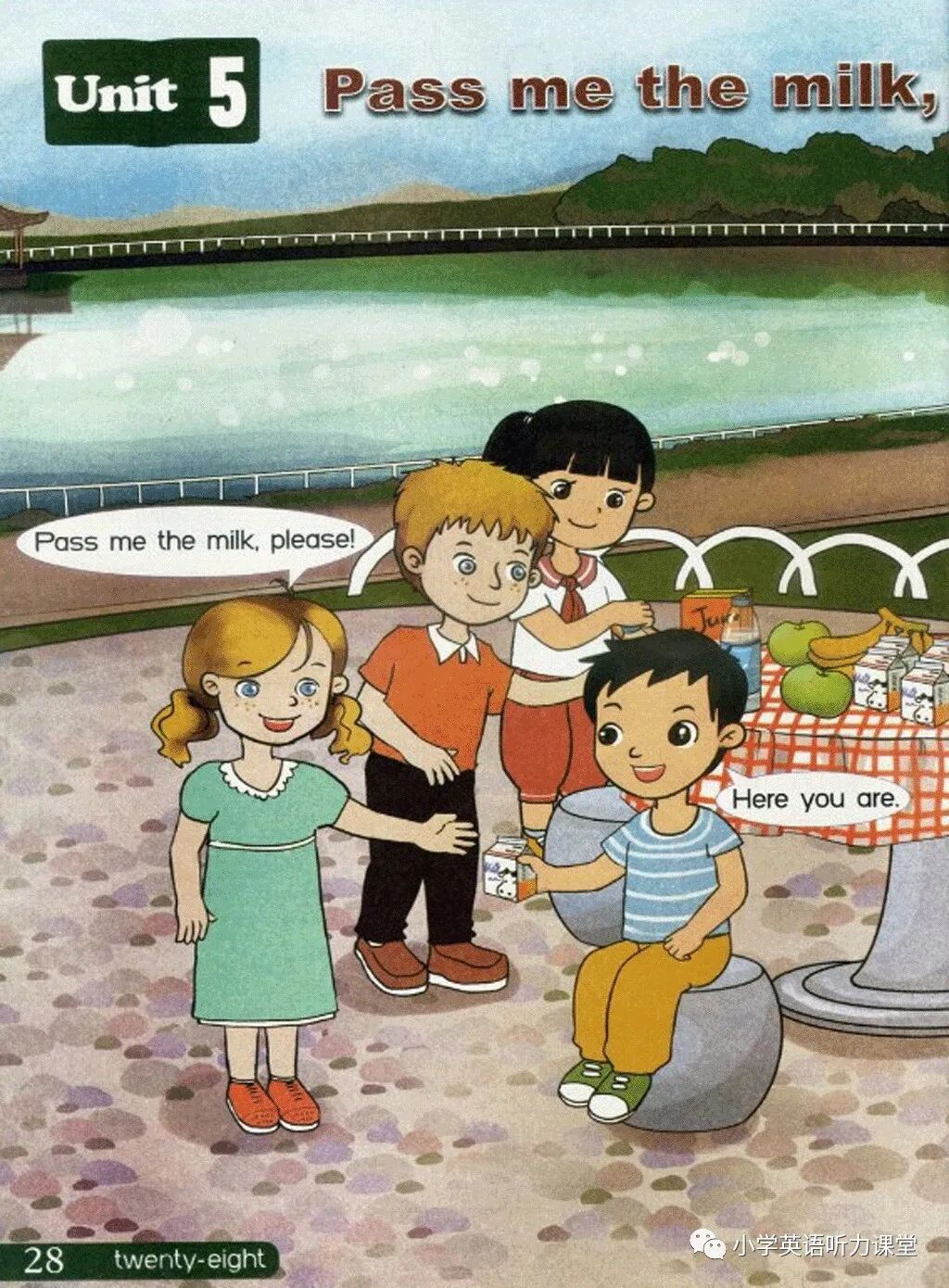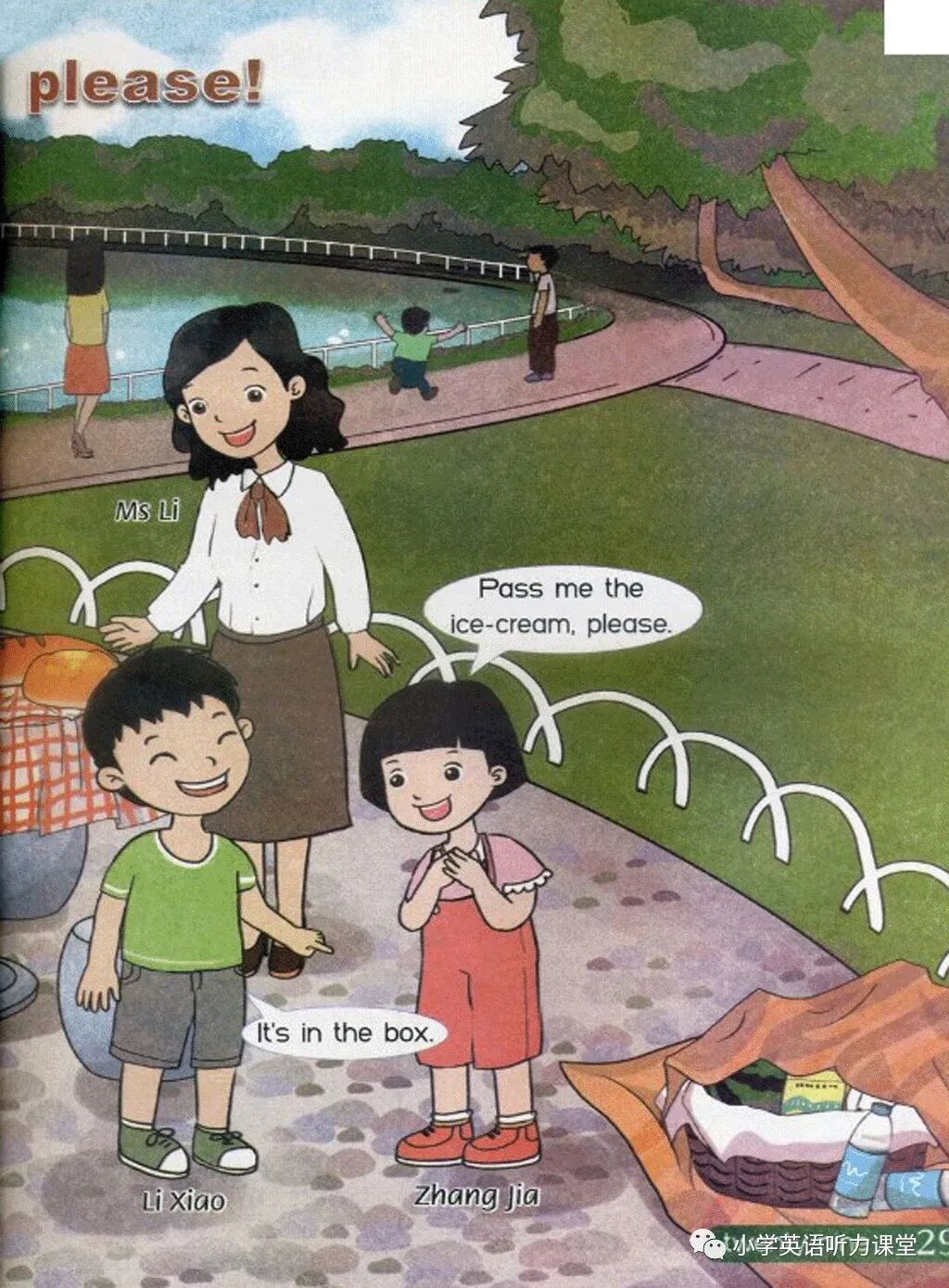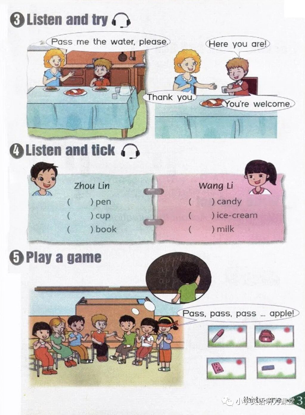 3.Listen and try.听一听,试一试。Pass me the water, please.请把水递给我。Here you are.给你。Thank you.谢谢。You're welcome.不客气。4.Listen and tick.听音并打勾。Pass me the pen, please.请把钢笔递给我。Here you are, Zhou Lin.给你,周林。Thank you.谢谢你。Please pass me the milk.请把牛奶递给我。OK, Wang Li.好的,王丽。Here you are.给你。Thank you.谢谢你。You’re welcome.不客气。5.Play a game.做游戏。Pass, pass, pass ... apple!传,传,传......苹果!