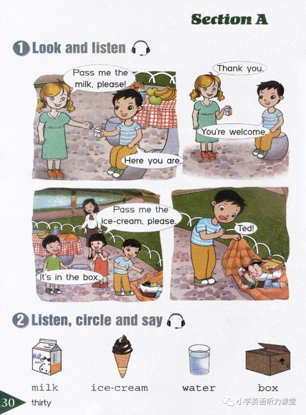 Unit 5Pass me the milk, please!第五单元请把牛奶递给我! Section A A部分1.Look and listen.看一看,听一听。Pass me the milk, please!请把牛奶递给我!Here you are.给你。Thank you.谢谢。You're welcome.不客气。Pass me the ice-cream, please.请把冰淇淋递给我。It's in the box. Ted!泰德,在盒子里。2.Listen, circle and say.听音,画圈并说一说。