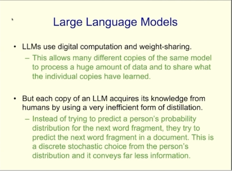 如果你看一下大型语言模型,它们使用数字计算和权重共享。但是模型的每一个副本,每一个 agent,都在以一种非常低效的方式从文件中获取知识。用一个文件并试图预测下一个单词,实际上是非常低效的知识蒸馏,它学习的不是教师对下一个词的概率分布的预测,而是文件作者所选择的下一个词的内容。因此,这是很低的带宽。而这就是这些大语言模型向人们学习的方式。