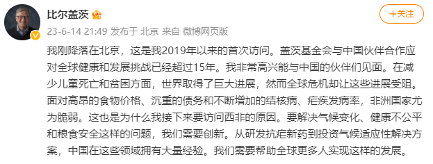 北京时间6月14日晚,微软创始人比尔·盖茨在微博和推特发文称已抵达北京,这是他自2019年以来的首次访问。他说,盖茨基金会与中国伙伴合作应对全球健康和发展挑战已经超过15年,很高兴能与中国的伙伴们见面。(经济观察网)