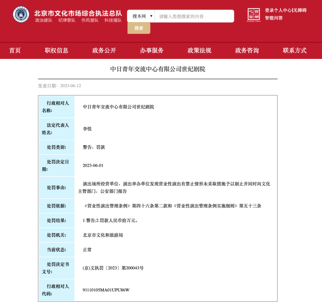 北京市文化市场综合执法总队网站显示,近日,中日青年交流中心有限公司世纪剧院被北京市文旅局罚款10万元,处罚事由为演出场所经营单位、演出举办单位发现营业性演出有禁止情形未采取措施予以制止并同时向文化主管部门、公安部门报告。据悉,该剧院系脱口秀演员李昊石(House)在5月13日事件中的演出场所。(每日经济新闻)