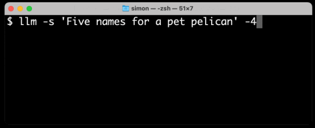 以下是使用我的llm CLI(https://github.com/simonw/llm)工具从GPT-4生成文本的结果,命令是llm -s 'Five names for a pet pelican' -4:
