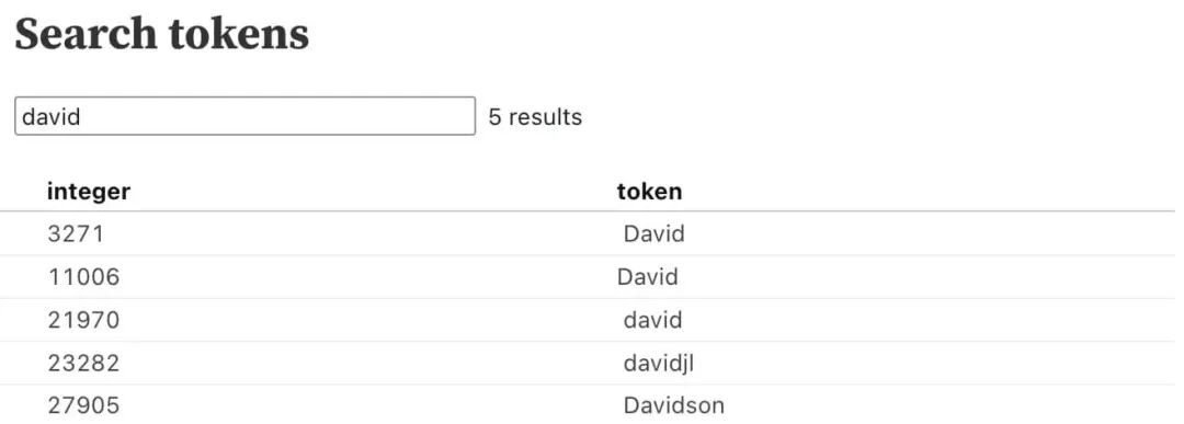 OpenAI提供了一个tokenizer,用以探索token的工作方式。我自己构建了一个更有意思的工具,是一个Observable notebook(https://observablehq.com/@simonw/gpt-tokenizer)。在这个Observable notebook中,你可以将文本转换为token,将token转换为文本,还可以搜索整个token表。