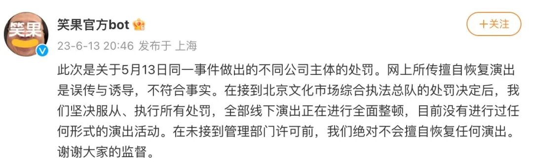 笑果回应擅自演出被罚