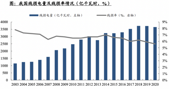 据东吴证券研报统计,随着我国智能电网的完善,线损(指电力网在电能的输送、分配、管理等环节中所造成的损失)率已从2003年将近8%降至2020年的5.5%。然而以0.54元/度计居民用电,2020年我国线损电量消耗仍超1890亿元。
