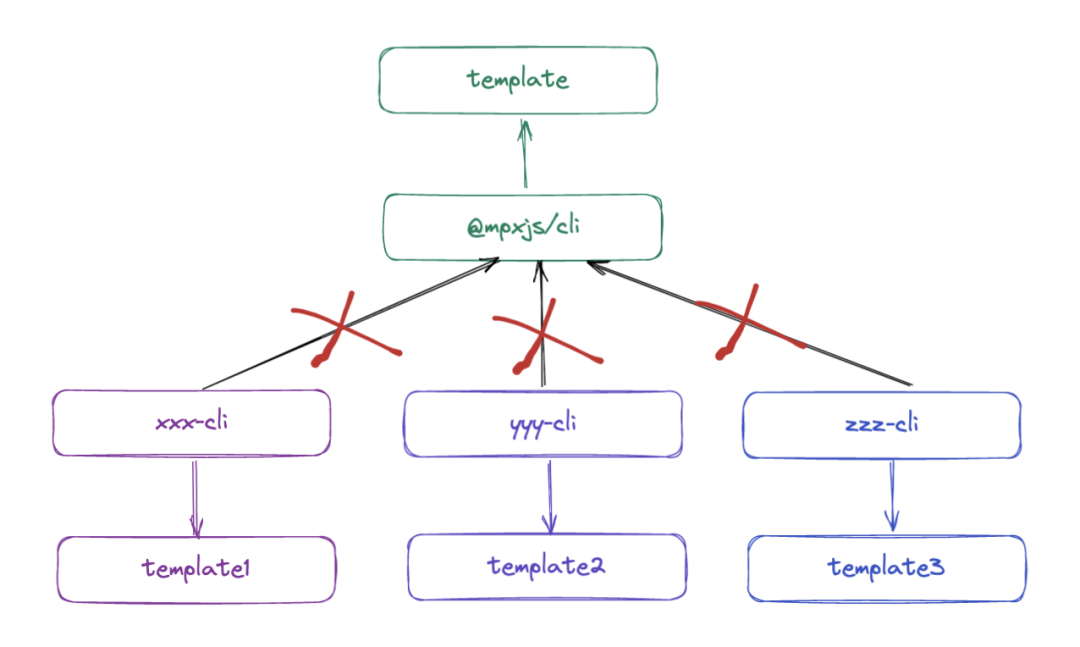 与此同时, 滴滴其他业务团队有很多定制化的开发需求,每个团队内部也维护满足各自基于 Mpx小程序业务开发场景的脚手架工具+远程模板,但是这种模式所带来的问题是各业务团队和@mpxjs/cli2.x之间联系的割裂,完全没办法感知到@mpxjs/cli2.x任何功能更新。各团队如果要进行跟进升级基本都是需要改 cli 代码,然后再到各业务项目当中进行手动升级,成本很大。