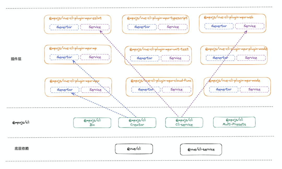 我们将 @vue/cli、@vue/cli-service分别作为 @mpx/cli和@mpx/cli-service 的底层能力,即利用插件化的架构设计,同时还非常灵活的满足了 Mpx 做差异化场景迭代的定制化改造。上层的插件满足vue-cli-plugin插件开发的规范,最终底层的能力还是依托于 @vue/cli和 @vue/cli-service进行工作。