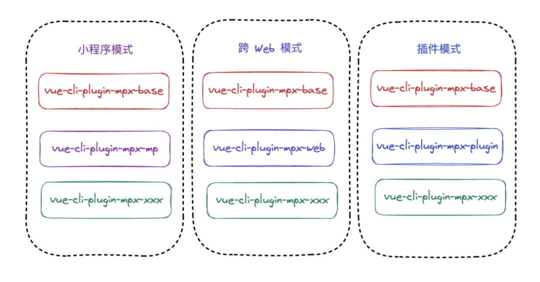 的基础上去拓展webpack配置以满足小程序的编译构建。在跨web的开发模式下,vue-cli-plugin-mpx-web会在 vue-cli-plugin-mpx和@vue/cli的基础上去拓展配置以满足web侧的开发编译构建。
