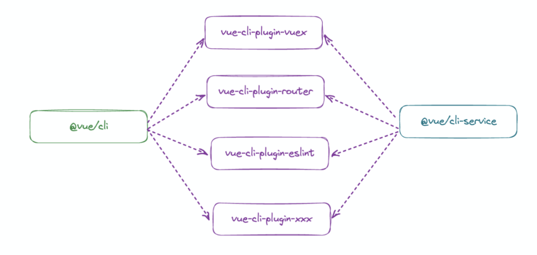 @vue/cli@3.x及以上相较2.x版本,整个 @vue/cli的架构发生了非常大的变化,从基于模板的脚手架迭代为基于插件化的脚手架,简单概述整个插件化的构架是: