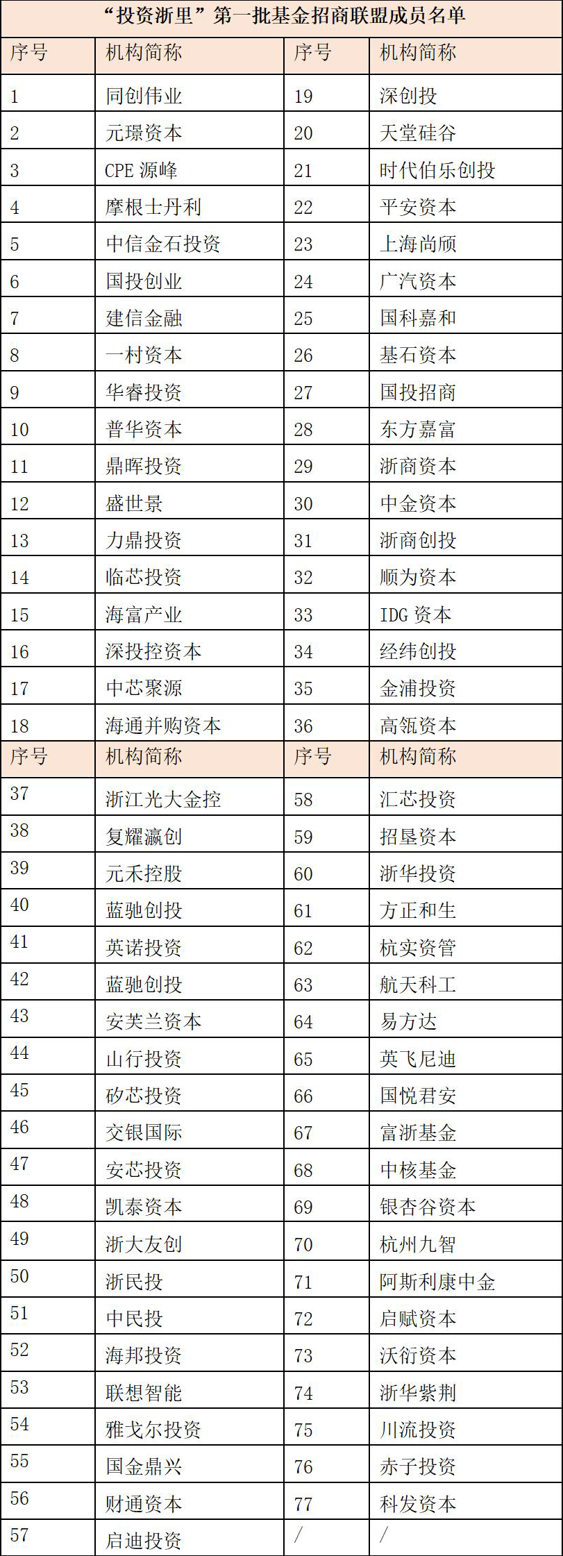 4月份,浙江人民政府公布第一批“投资浙里”基金招商联盟成员名单,包括同创伟业、摩根士丹利、CPE源峰、深创投、高瓴资本等在列 77家知名投资机构悉数在列。