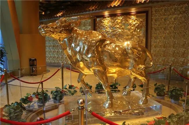 据说,仅酒店大厅摆列的一座金牛像,就价值3个亿。