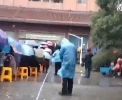 视频中,村民打着雨伞、坐着小板凳在华西村广场排起长龙,等待兑付资金。