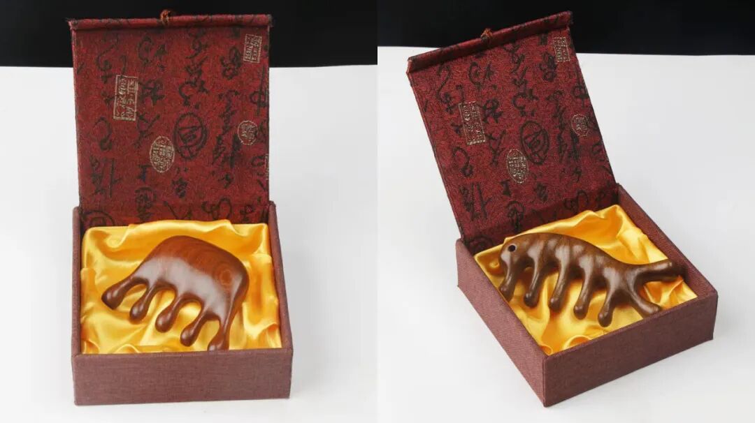 医书《诸病源候论》就有记载,“千过梳头,头不白”。梳子是我们最常见的生活用品,除了梳头,它还能被用于疏通经脉,促进头皮血液循环和新陈代谢。经络梳的材质又很多种,有桃木梳、黄杨梳和檀木梳,其中属檀木梳最为珍贵。金丝檀木木质坚硬,香气清雅,梳齿是圆头的,梳头发不容易打结,而且梳背也加厚了,拨经、按摩二合一![]()