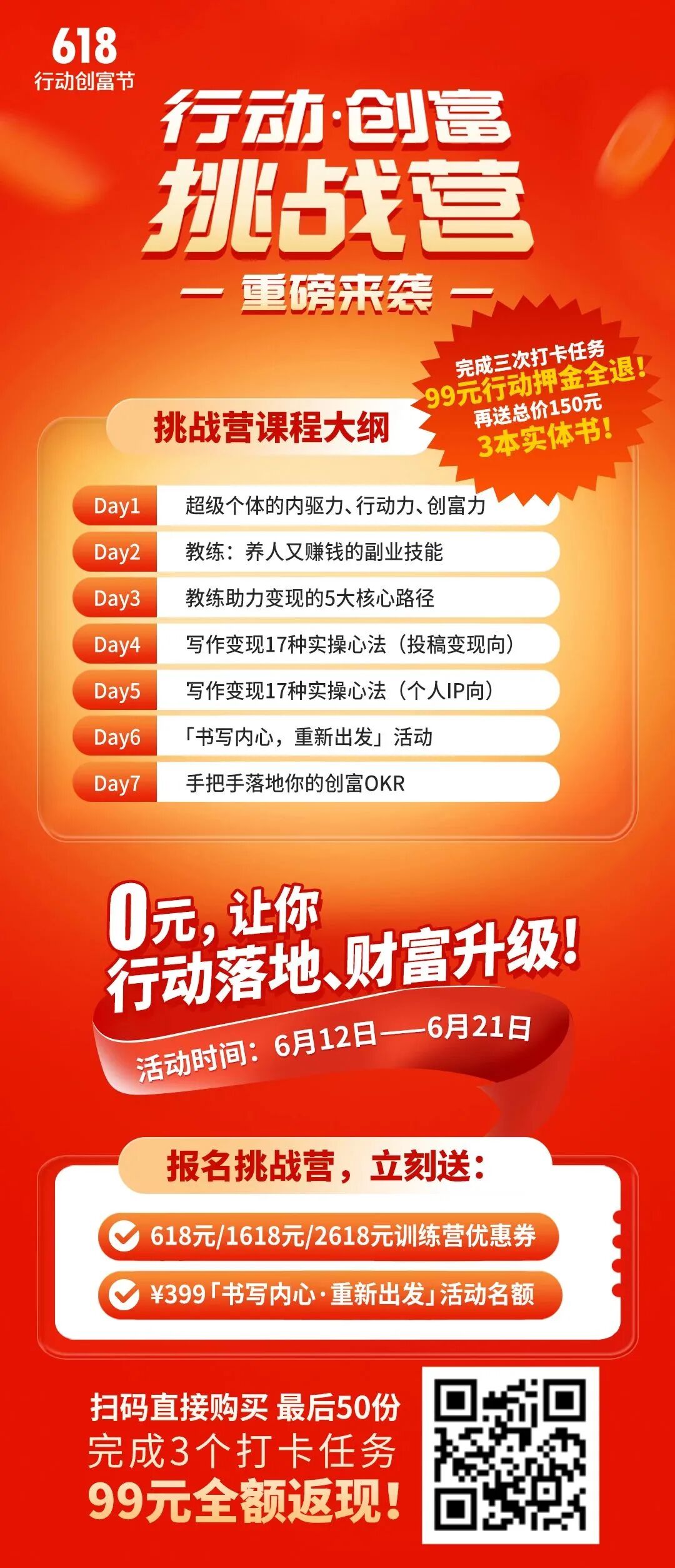 这个训练营总共7天,6月15日晚上7点半正式开营,现在是最后的加入机会!里面包含,6场直播,一场「书写内心·重新出发」的复盘活动,内容超级丰富,交付超级重。这就是我们一行给大家准备的第三届「618行动创富节」的超级礼物。但是注意,想要免费拿到这份礼物,有一个小小的条件,就是要完成我们行动创富挑战营的关卡,我们有课程的作业,也有复盘活动的模板。放心哈,我们不会强行让大家对外分享,也不会设置变态的任务,只要你参与课程,都是可以轻松完成的。报名时,支付99元的押金,直接参与我们的活动,只要全部3个作业,99元全部返现给你。(相信我,作业真的不难,每份作业200字,轻松搞定!)也就是说,只要你有那么一点行动力,一分钱都不用花,就能够:4、还能获得三张总价值近5000元的训练营现金抵扣券而且,买一个训练营,抵扣618元,买两个,直接抵扣1618元,买三个抵扣2618元,层层叠加,绝对是全年最优惠的促销力度了!哪怕你不买训练营,光是免费拿3本实体书,就已经值回票价了呀!再次说明,这真的是我创办一行五年来,最优惠的活动了!!!无论从哪个层面来说,你都不亏,哪怕你只听了一节直播课,都是值回票价的,更别说,还有那么多礼物送给你。我们搭上人力和财力,只为做一件事,就是希望真切的带领所有小伙伴,行动起来,发生改变。如你所见,这次活动成本太高,我们只设置了1000个名额,现在已经售出了950份。剩下的50份,是我特意给我公众号的读者朋友们预留的,担心你们没时间去直播间,所以发篇文章,让你们赶上这趟末班车。想跟我一起学习的小伙伴,可以直接扫描下方海报二维码,支付99元行动押金,只要完成3次作业,99元全额返还,并且额外赠送3本实体书!就凭你们的行动力,肯定能把押金赚回来,还能得 3 本书,稳赚不赔!注:下单后,请务必添加弹出来的企业微信,她会给您兑换权益,帮您开通课程。6月15日晚上7点半,开营直播,不见不散!
