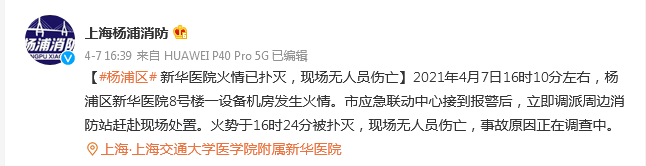 据上海杨浦消防 2021年4月7日消息,当日16时10分左右,上海杨浦区新华医院8号楼一设备机房发生火情。上海市应急联动中心接到报警后,立即调派周边消防站赶赴现场处置。火势于16时24分被扑灭,现场无人员伤亡,事故原因正在调查中。