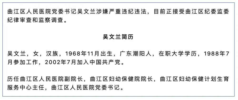 2023年6月,曲江区人民医院党委书记吴文兰涉嫌严重违纪违法,正接受曲江区纪委监委纪律审查和监察调查。