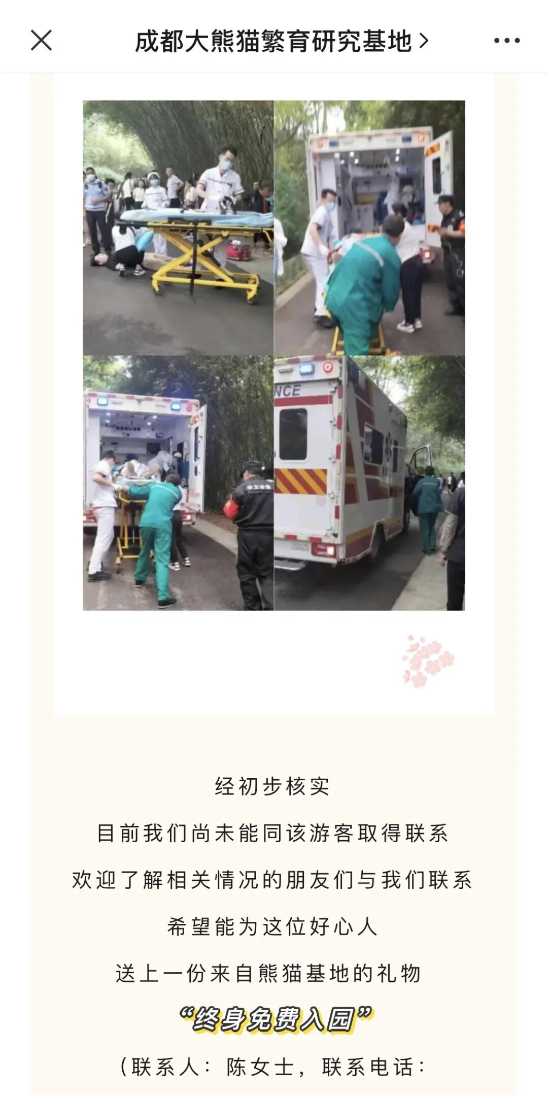 近日,一则“杭州医生在看熊猫花花路上救了个人”的消息在网上刷屏。5月21日晚,成都大熊猫繁育研究基地发布寻人启事,寻找在基地救人的“白衣天使”,并准备了“终身免费入园”的礼物。