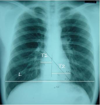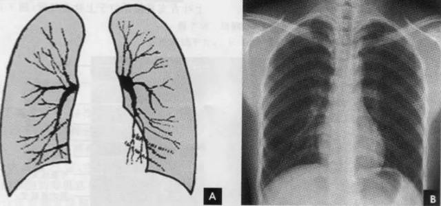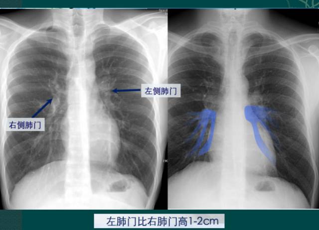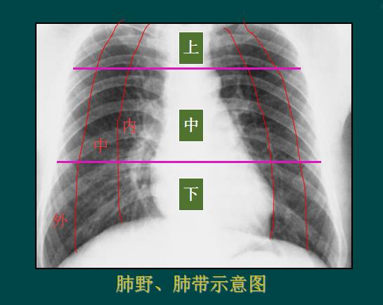 上图是胸部侧位片的拍摄,一般采取右侧位拍片,如果看心脏影可以采取左侧位片。斜裂:起自第5胸椎水平,倾斜向前下,大致与第6肋骨平行,止于前胸膜沟(前肋膈窦)后方数厘米的膈肌处。水平裂:大致呈水平走形,与第4前肋大致同水平,前部常低于后部,外侧部常低于内侧部。上图为:右肺下叶在正位与侧位的投影区域 。由于X线片是二维投影,因此中叶和下叶有一定的重叠。由于正位片通常会有一定的的重叠,因此侧位片可以对重叠部位的区域的定位起到很好的补充!肺纹理为自肺门向肺野呈放射状分布的树枝状阴影,它主要是肺动脉的投影,肺静脉、支气管和淋巴管也参与形成。肺纹理由肺门向外围延伸,逐渐变细,至肺野外带渐细小而稀少,距侧胸壁内缘约1cm范围内的肺野基本无肺纹理可见(图下图)。 纵隔两旁含气的肺在胸片上所显示的透明区域称肺野,其透明度随呼吸而改变,深吸气时肺内含气量增多,透明度增高,呼气时则相反。 为便于指明病变的部位,通常人为地将一侧肺野纵向分为三等分,即内、中、外带。又分别在两侧第2、4肋骨前端下缘划一水平线,将肺野横向分为上、中、下三个肺野。(如上图)。 x线肺门指肺动脉、肺叶动脉、肺段动脉、伴行支气管以及肺静脉构成。右肺门可分为上、下两部。上部约占1/3,由上肺静脉、上肺动脉及下肺动脉后回归支构成。上肺静脉下后干构成右上肺门的外缘;右肺门下部 约占2/3,由右下肺动脉干构成,其正常宽度不超过15mm,沿中间段支气管外缘平行向外下走行。右肺门上、下部相交形成一钝的夹角,称肺门角,正常该角顶清晰。如下图左肺门亦分为上、下两部。上部由左肺动脉及其分支、左上叶支气管和左上肺静脉及其分支构成;下部由左下肺动脉及其分支构成,常被心影所遮盖。