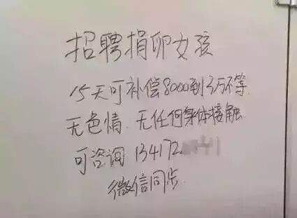 “招聘捐卵女孩,15天可补偿8000-3万不等,无色情,无任何身体接触”