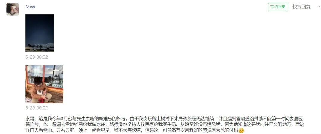 由于我贪玩爬上树掉下来导致旅程无法继续,并且遇到雪崩道路封锁不能第一时间去县医院拍片,他一遍遍去雪地铲雪给我做冰袋,路很滑也坚持去牧民家给我买牛奶。