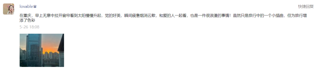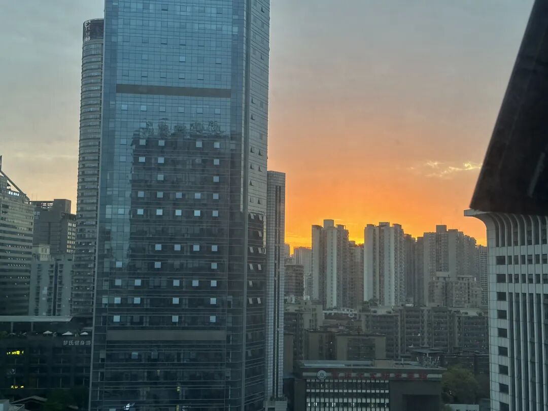 在重庆,早上无意中拉开窗帘看到太阳慢慢升起,觉得好美,瞬间疲惫烟消云散,和爱的人一起看,也是一件很浪漫的事情!虽然只是旅行中的一个小插曲,但为旅行增添了色彩。