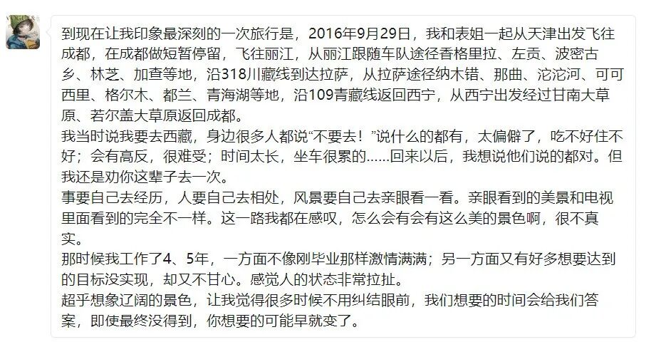 到现在让我印象最深刻的一次旅行是2016年9月29日,我和表姐一起从天津出发飞往成都,在成都做短暂停留,飞往丽江,从丽江跟随车队途经香格里拉、左贡、波密古乡、林芝、加查等地,沿 318川藏线到达拉萨,从拉萨途经纳木错、那曲、沱沱河、可可西里、格尔木、都兰、青海湖等地,沿109 青藏线返回西宁,从西宁出发经过甘南大草原、若尔盖大草原返回成都。
