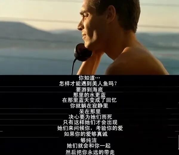 “你知道怎么才会遇见美人鱼吗?要游到海底,那里的海更蓝,在那里蓝天变成了回忆,躺在寂静中,你决定留在那里,抱着必死的决心,美人鱼才会出现。