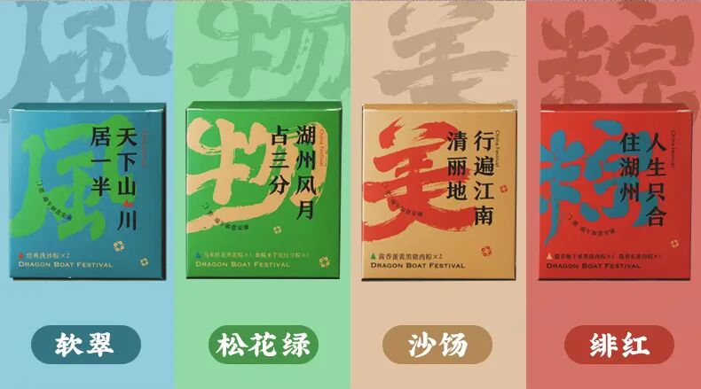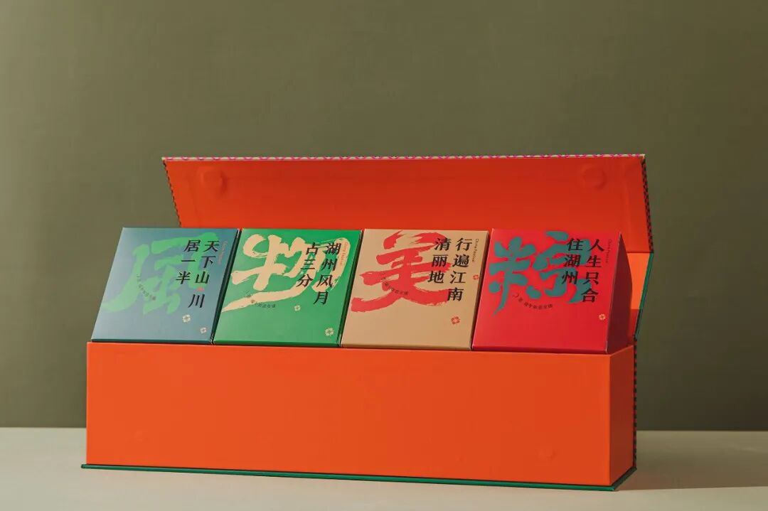 内盒采用了软翠松花绿沙饧绯红四种中国传统色做包装,风韵更足。手写字体镶嵌两句描写湖州风光的诗句,“天下山川居一半,湖州山川占三分”“行遍江南清丽地,人生只合住湖州”,希望收到礼盒的你,也能共睹这份湖光山色。
