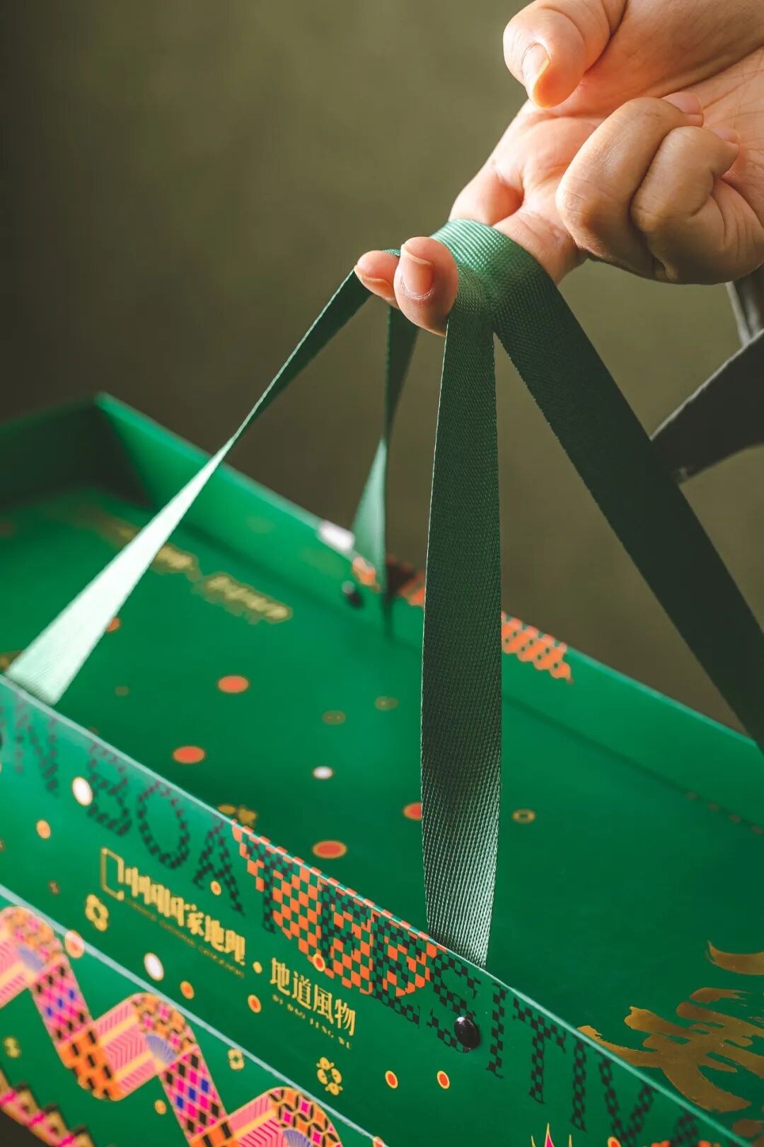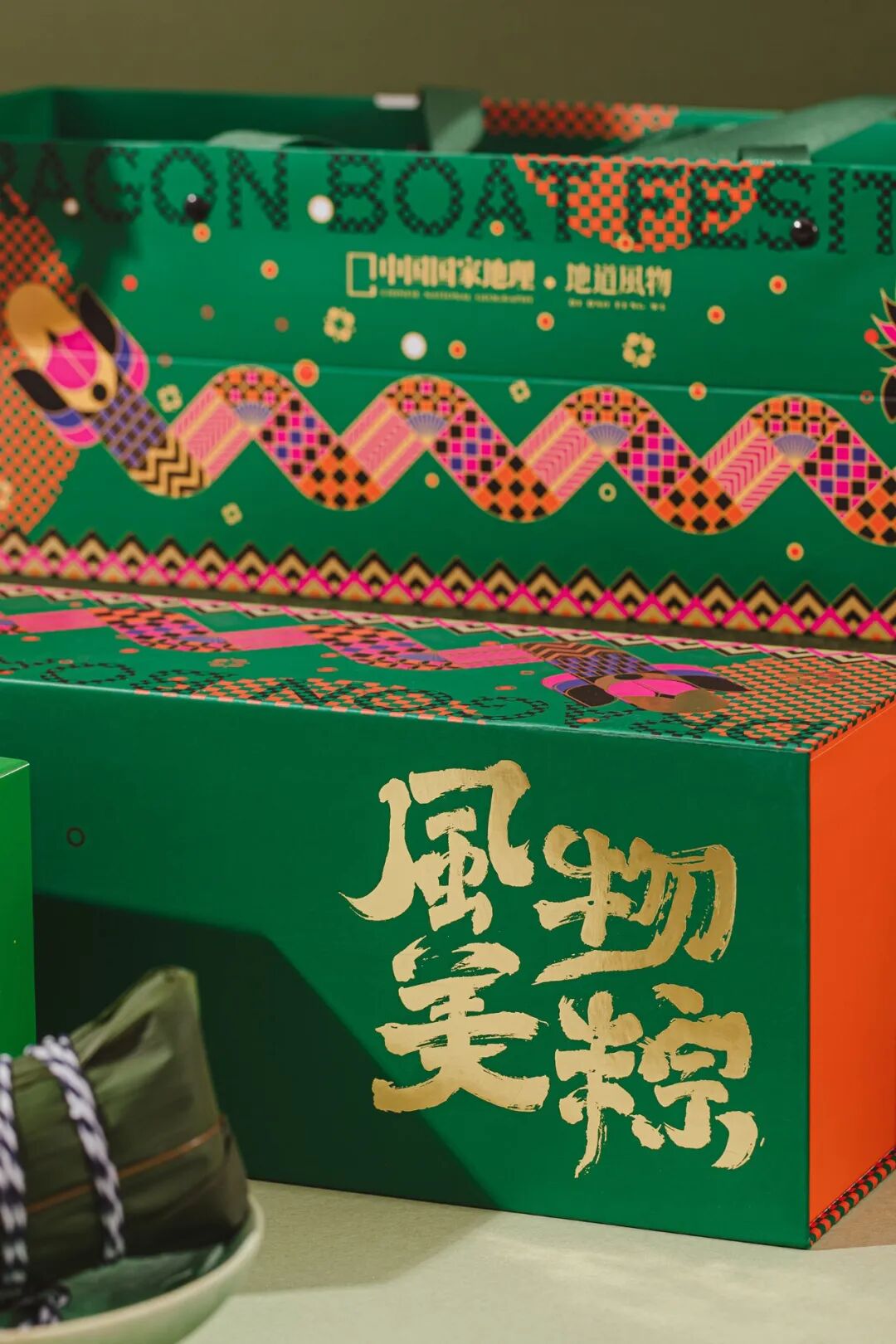 包装上的设计灵感来自湖州舞龙——长兴百叶龙,以龙为造型的整个礼盒充满”精气神“。国潮礼盒,粽绿色和橘色的撞色礼盒,尽显国潮风范
