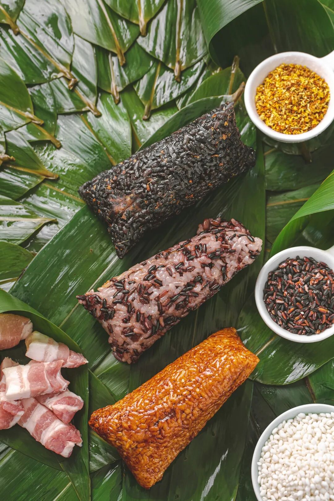 乌米更是为整个粽子的味道添彩。乌米的制作需要用圆糯米和南烛叶提取的汁浸泡8-12小时,经历九道工序(采叶、摘选、取泉、清洗、捣叶、熬汁、浸泡、蒸煮、晾晒)制作而成,每一颗米粒都晶莹乌黑,香气宜人!