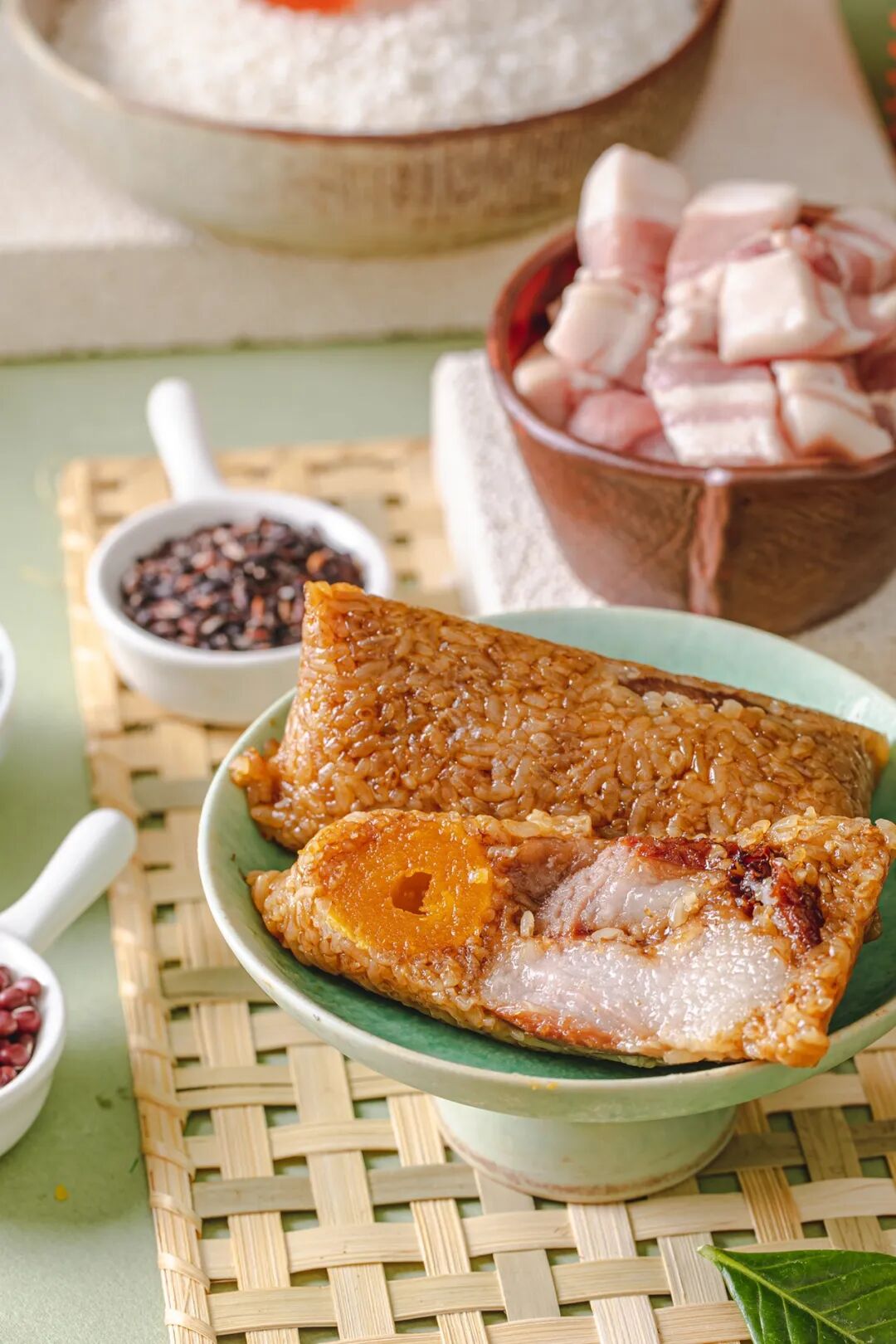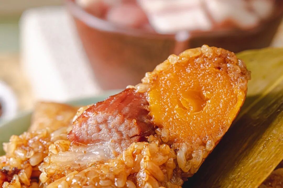 蛋黄当然是要来自高邮的整颗蛋黄,古法草木灰腌制的咸蛋黄,松沙起油、香而不腻,包裹在粽子中,吃起来更是可感受它沙感细腻,回味无穷的奇妙口感。