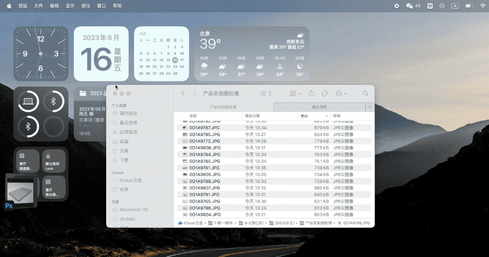 最重要的是,在桌面上摆上多多少少的小组件之后,如何仍然保证不影响打开应用时候的体验呢,会不会显得桌面很乱,影响操作呢?苹果采取的方式是在弹出窗口的时候,桌面小组件自然切换到单色,一个更低调的状态,在打开和隐藏文件夹的时候,切换很自如,不过在调出/隐藏PhotoShop的时候,反应不那么灵,说明有些应用的适配还不太好。![]()